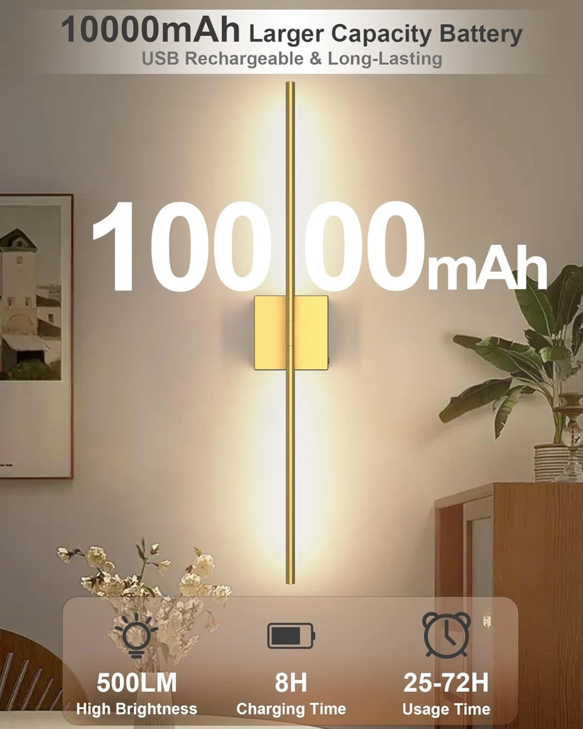 【10000mAh High-Capacity Rechargeable Battery】Our LED wall sconce is equipped with a detachable 10000mAh large-capacity battery, delivering up to 20 hours of continuous lighting at maximum brightness and 60 hours at the lowest setting for soft ambient glow. It not only provides reliable, hassle-free lighting but also doubles as elegant wall decor, instantly infusing warmth and romance into any room of your home(Tips: If the wall lights cannot be light up, please rotate the lamp tube slightly)