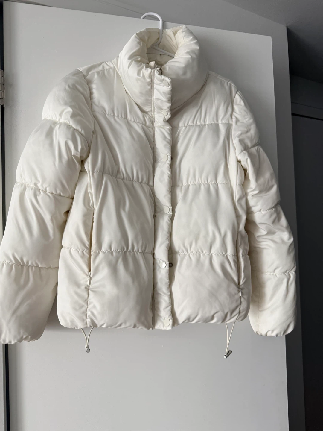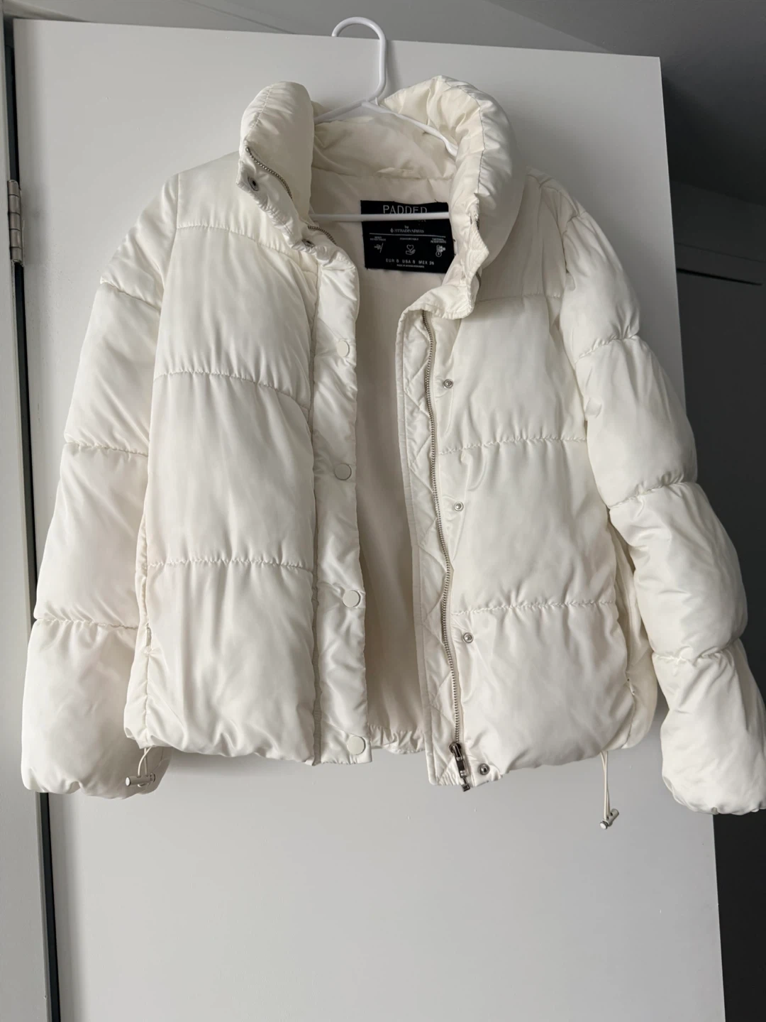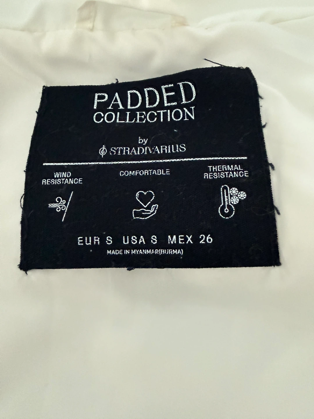 This is a white padded jacket by Stradivarius from their Padded Collection. It offers wind and thermal resistance for comfort. Size EUR S, USA S, MEX 26.