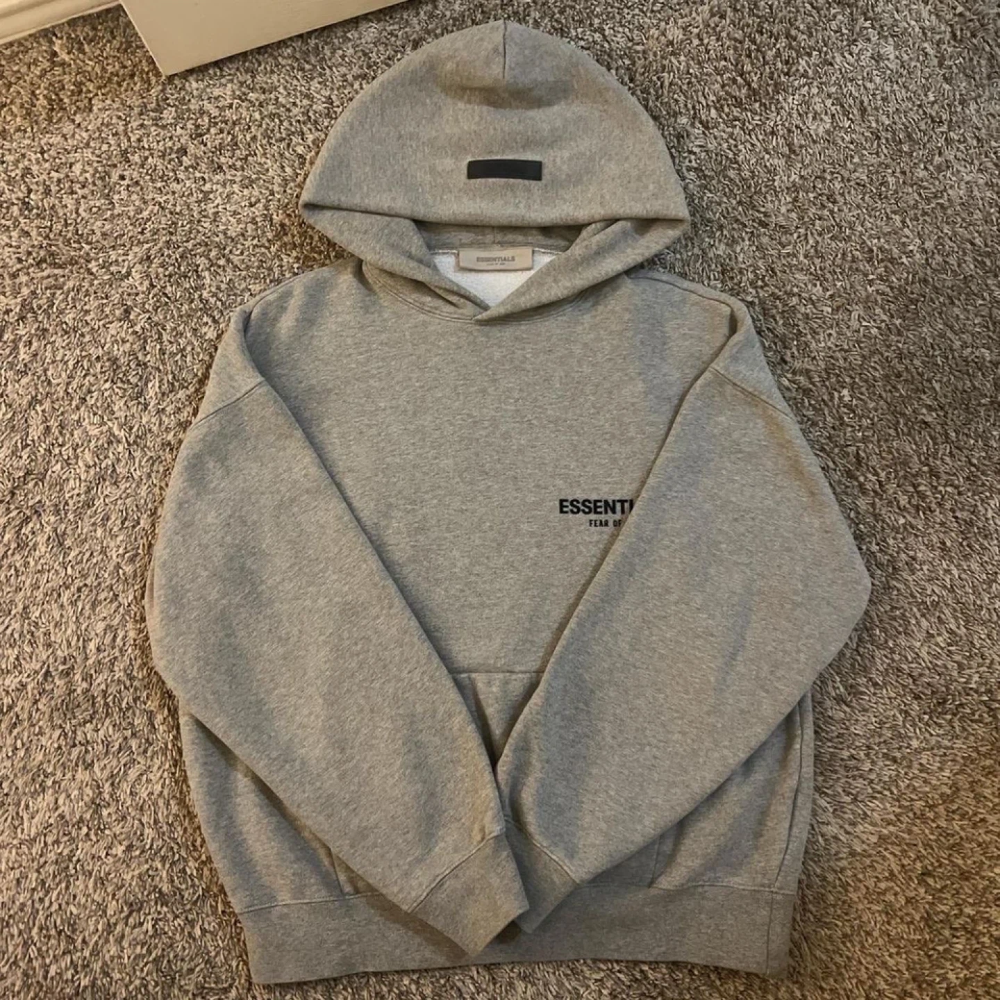 1:1 Grey Fear of God Essentials hoodie. It's a pullover style with a front pouch pocket and a drawstring hood. Cotton blend material.