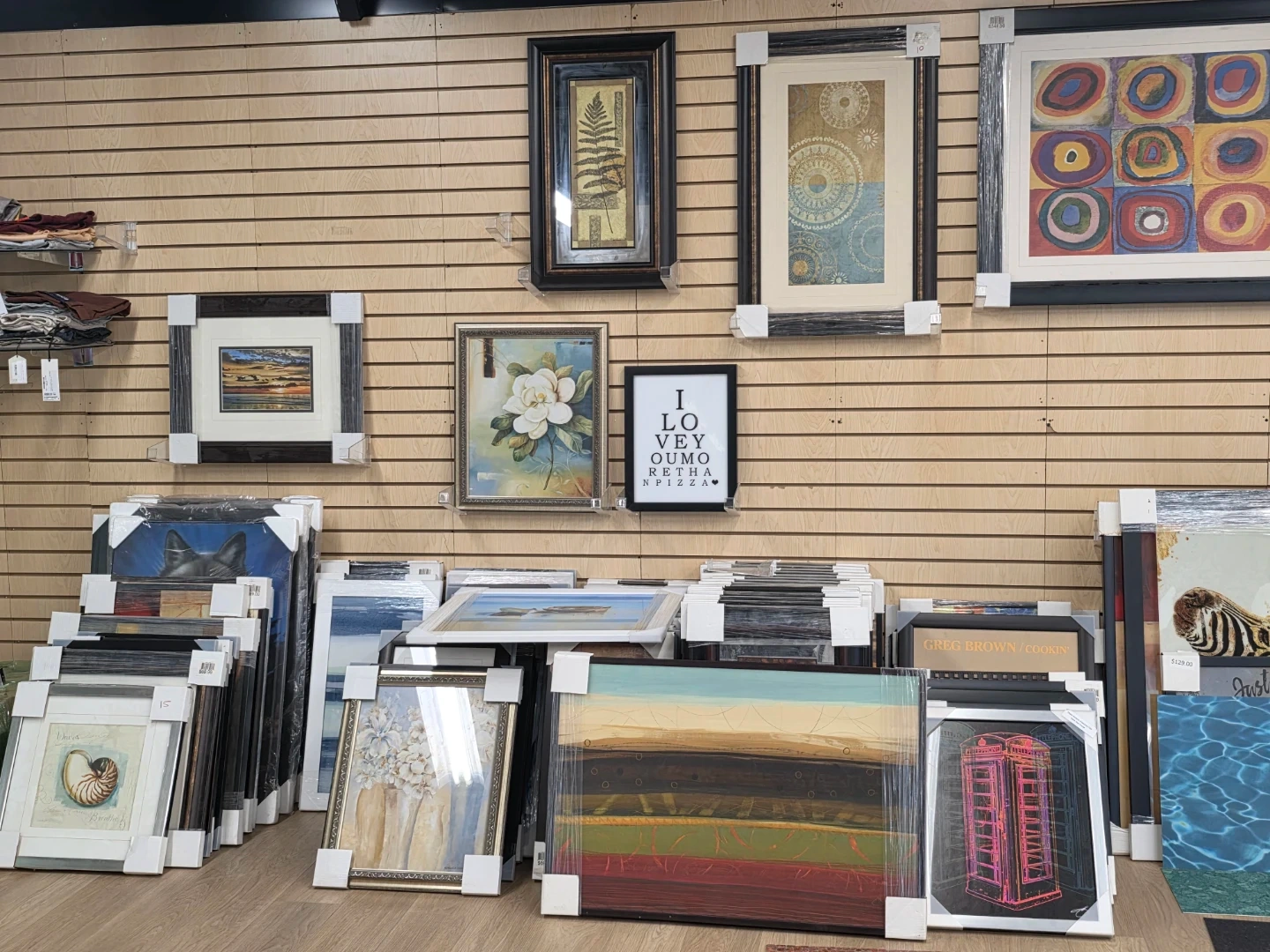 A selection of framed art pieces is available. Various styles and sizes are displayed, ready to enhance your home decor. These pieces are suitable for living rooms, hallways, or offices.