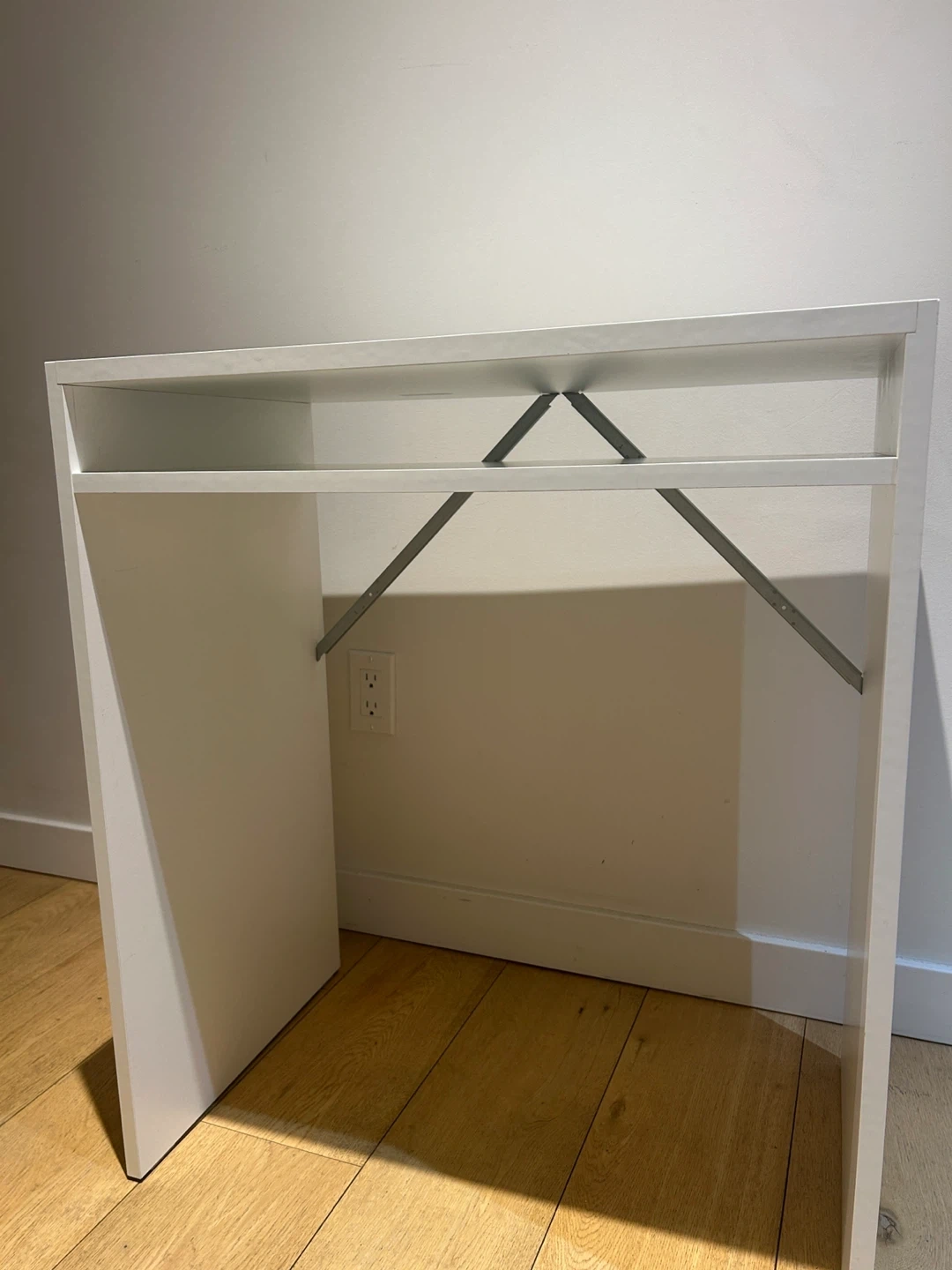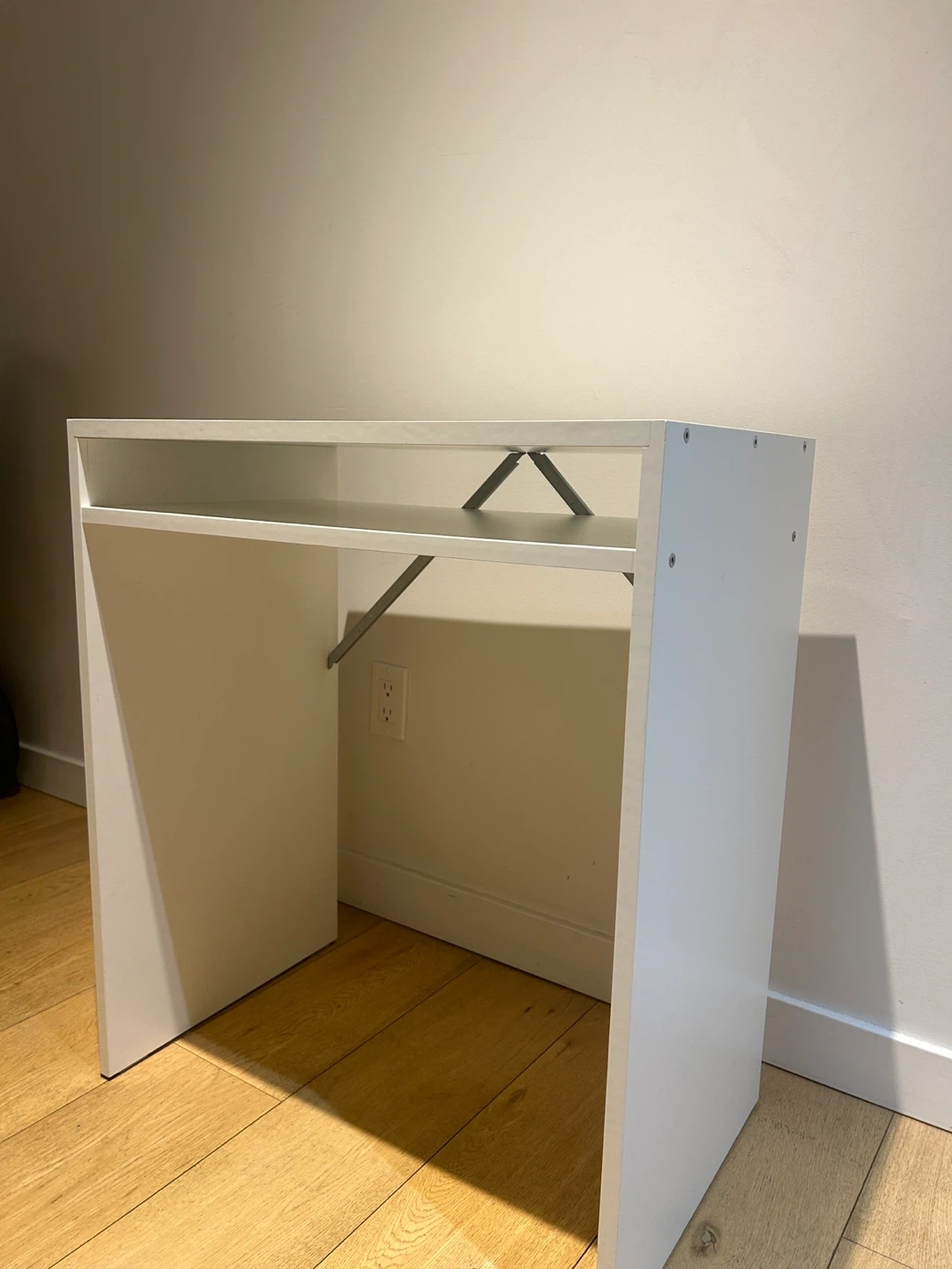 Compact white desk with an integrated shelf. It's made of sturdy material and includes metal support brackets. This desk is great for a small office or study space. Very good condition.