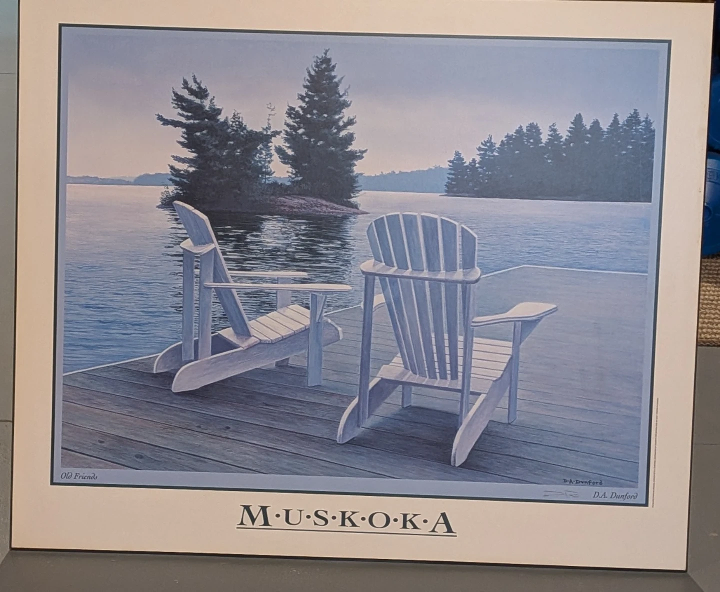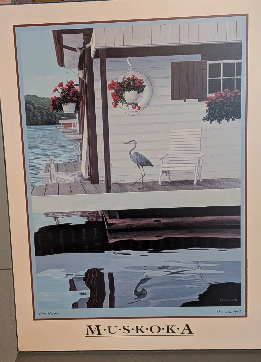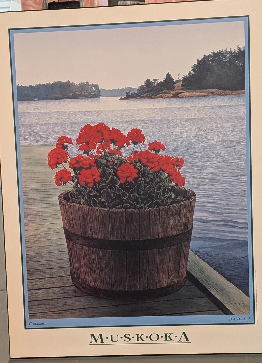 Collection of D.A. Dunford art prints depicting Muskoka scenes. Prints include 'Old Friends', 'North & South', 'Classic', 'Geraniums', and 'Boathouse Window'.