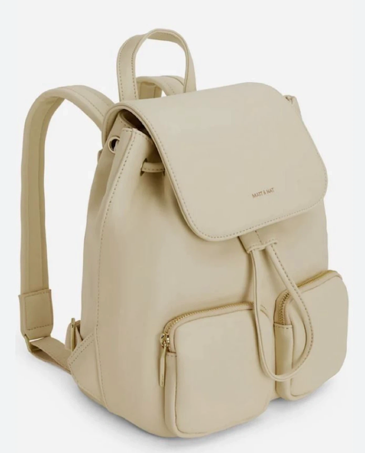 Looking to sell this cute cream-coloured backpack from Matt & Nat! It's made of vegan leather and has a drawstring closure with a flap. The backpack has adjustable straps and a couple of handy pockets on the front. Perfect for everyday use or a weekend adventure