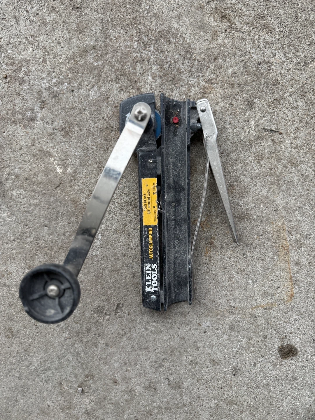 This is a Klein Tools 7.25-in plastic cable cutter. It's an auto-clamping tool designed for 30 AWG stranded cable. It has been used only twice!