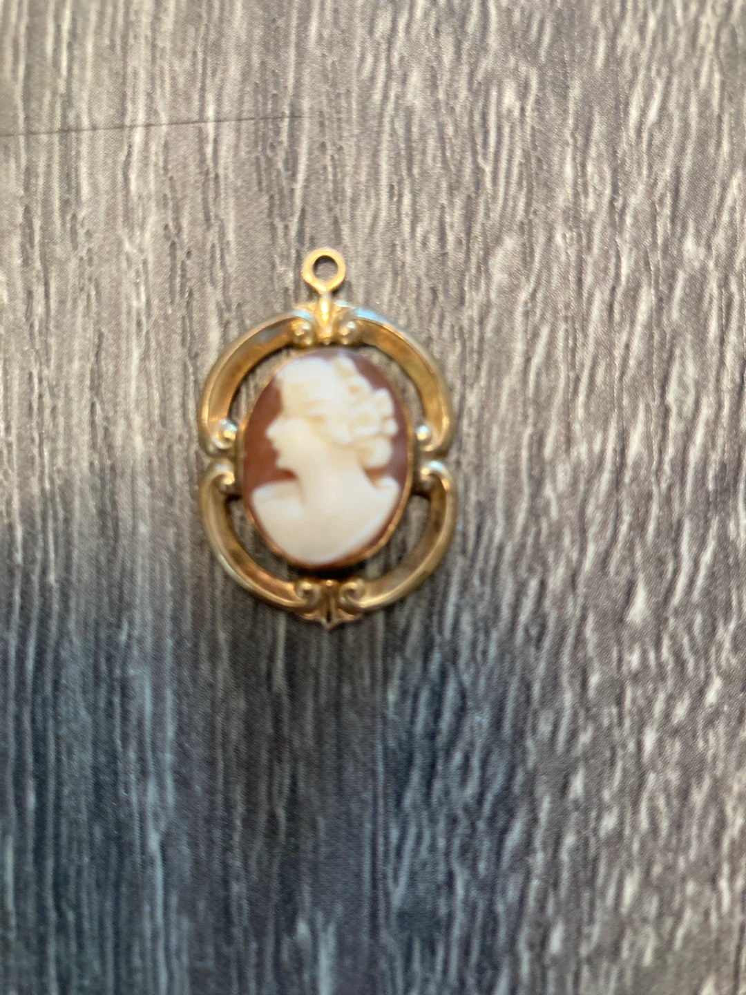 This is a vintage cameo pendant charm featuring a woman's profile. It's set in a decorative gold-toned metal frame. This charm would be lovely for adding to a bracelet or necklace.