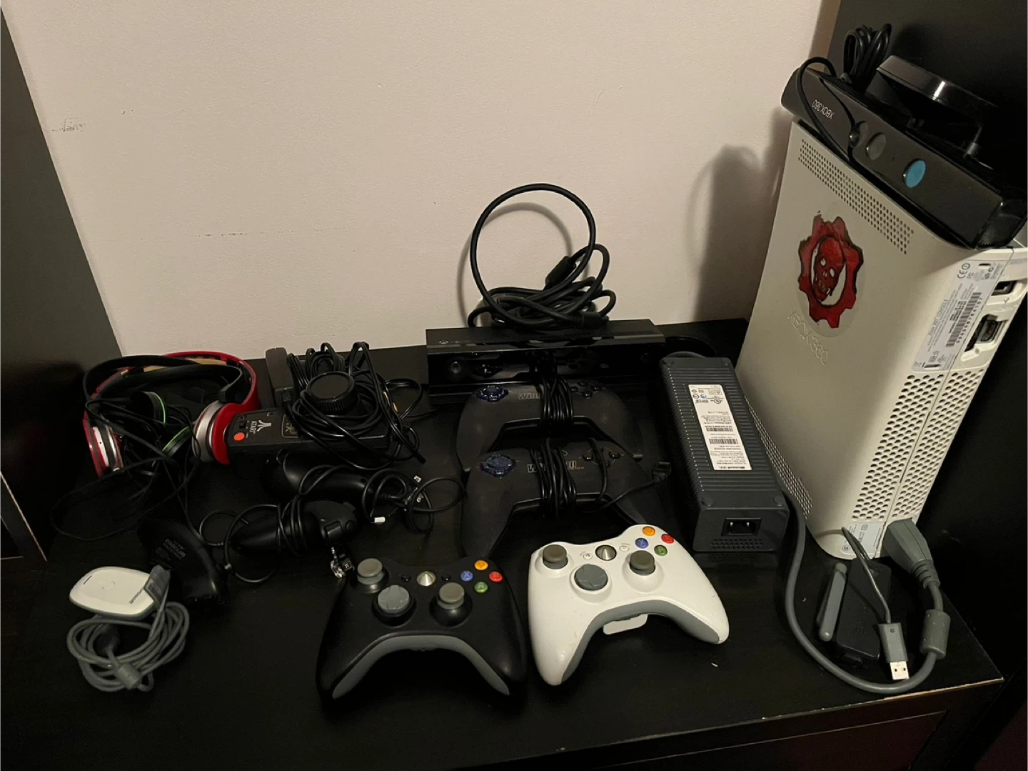 White Xbox 360 console with 2 controllers and various gaming accessories, including wired and wireless controllers, headsets, and other peripherals. Everything is in working condition.