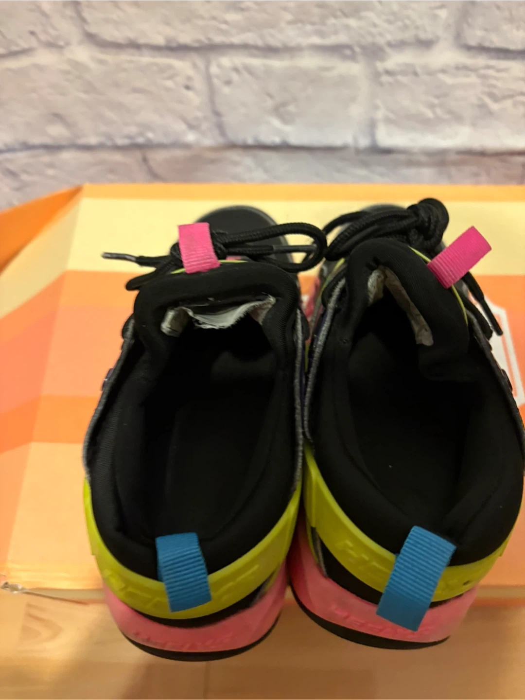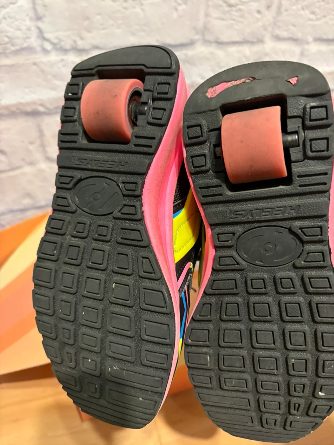 These are black Heelys roller shoes with pink, yellow, and blue accents. They feature removable wheels and lace-up closure. These are great for kids who want to skate and walk! Pick up only.