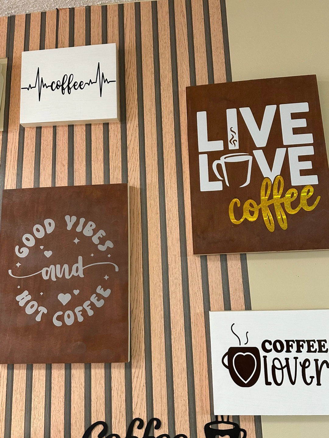 Four rustic-style wooden signs with coffee-themed sayings. Perfect for kitchen or coffee bar décor. Varying colours and fonts.