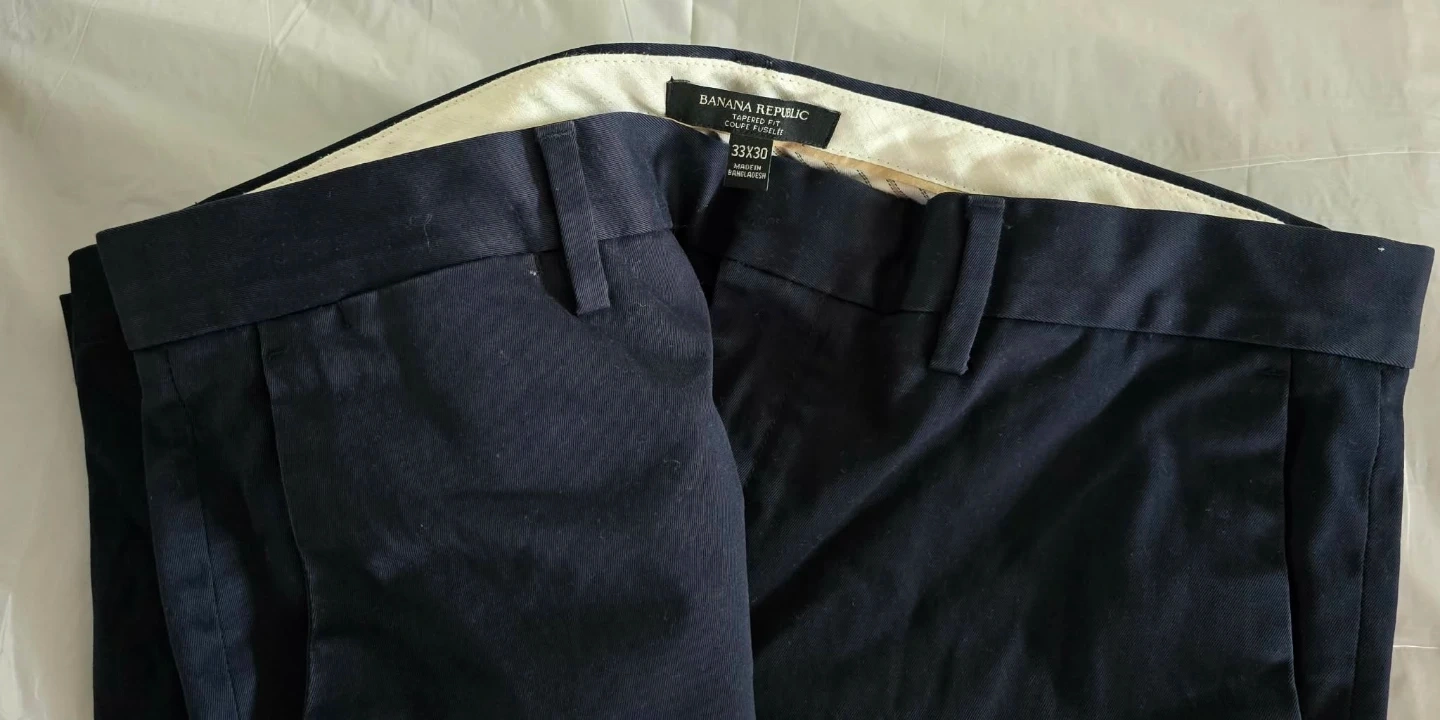 Navy chinos from Banana Republic. These pants are a size 33x30. They're made of a cotton blend for comfort. These trousers are great for dressing up or down!