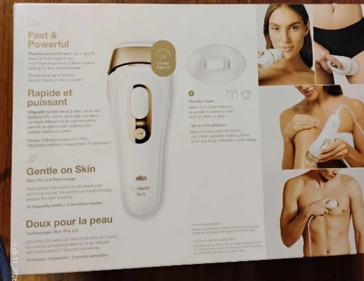This Braun Silk-expert Pro 5 IPL hair removal system offers fast and powerful results. It features 10 intensity levels and 2 sensitive modes, with SkinPro 2.0 technology that automatically adapts to your skin tone. It's designed for long-lasting smooth skin.