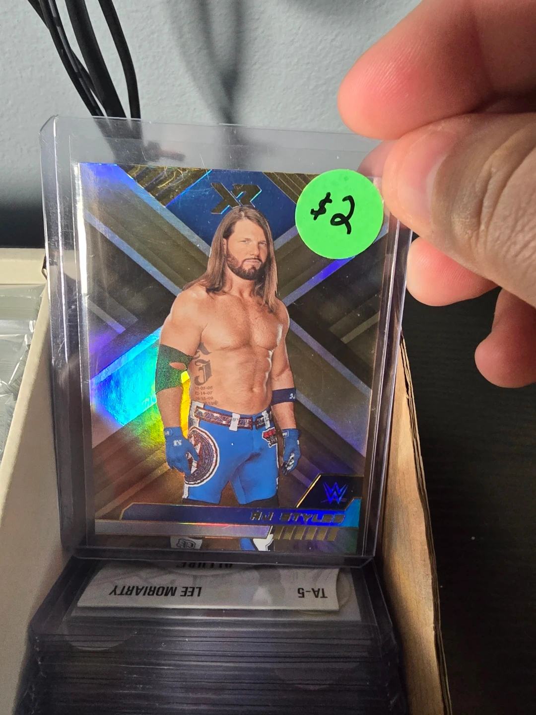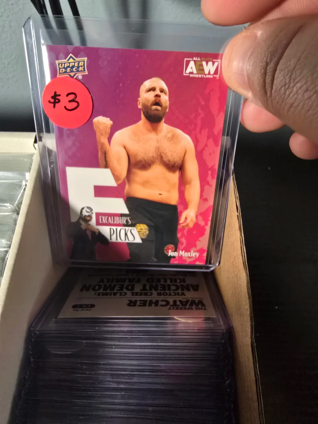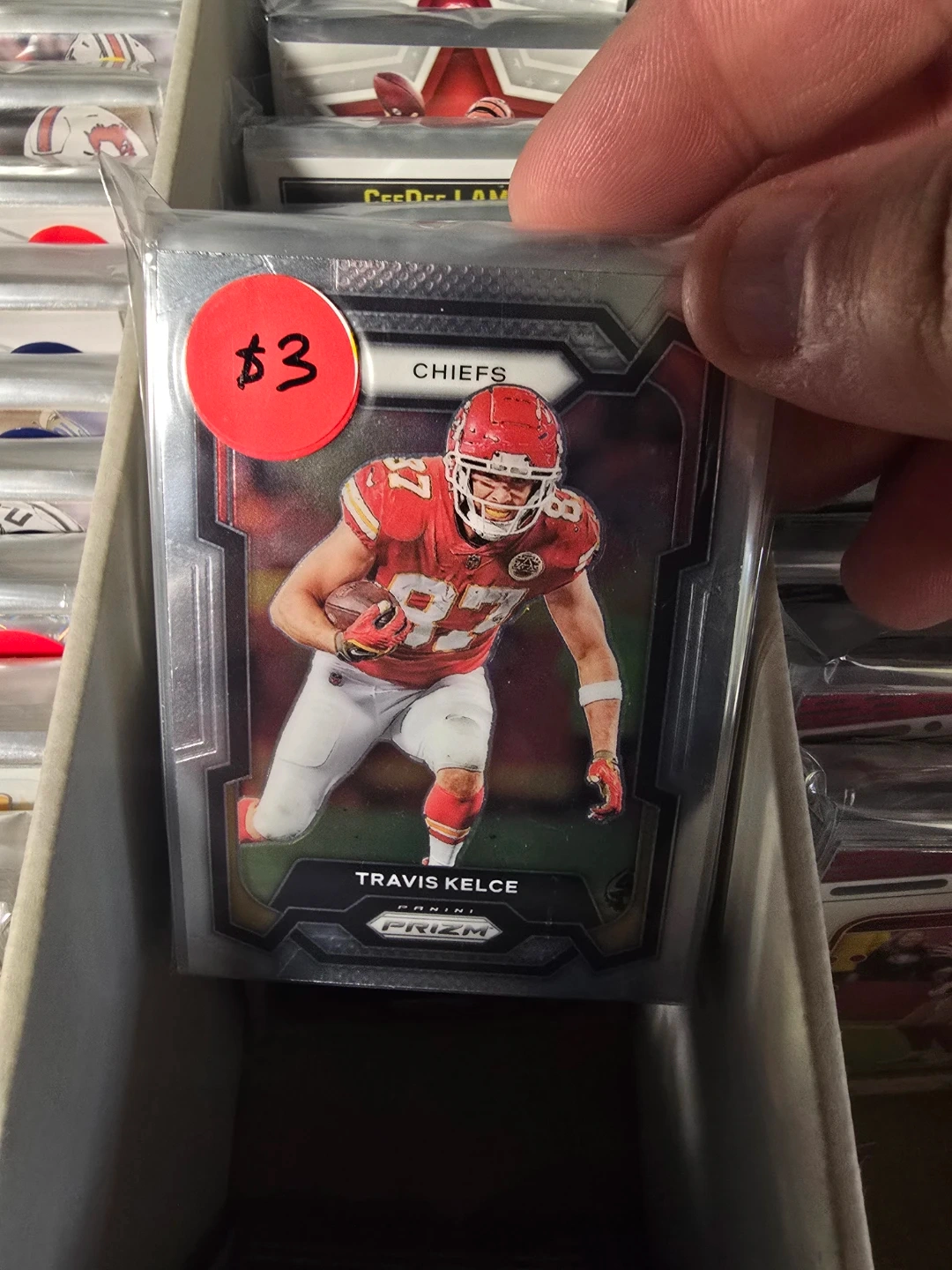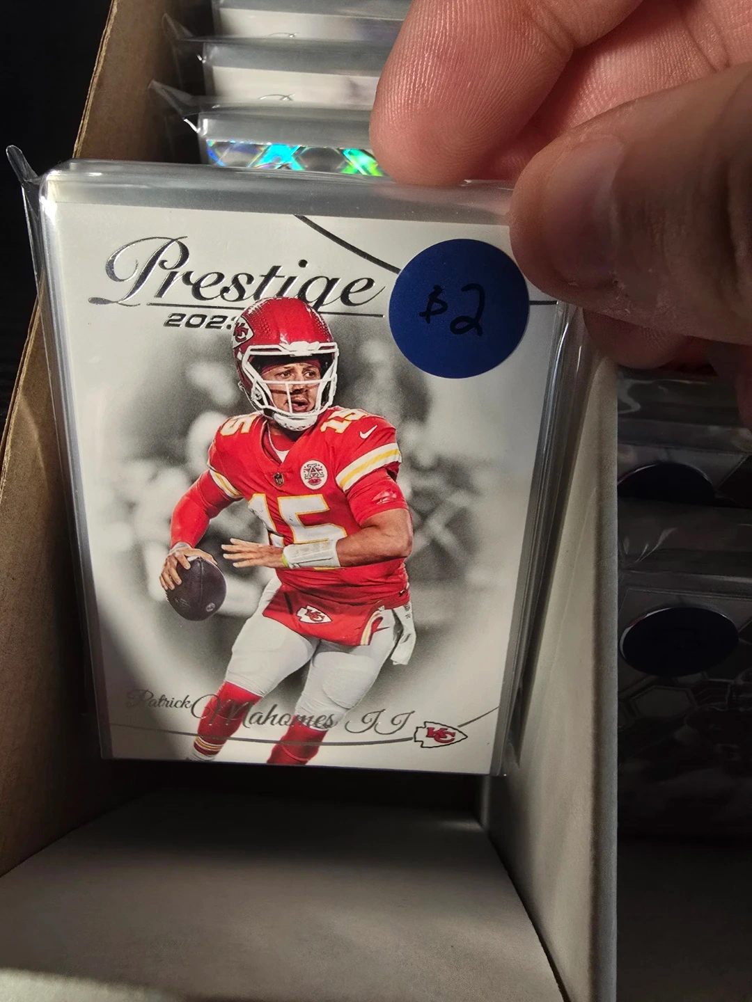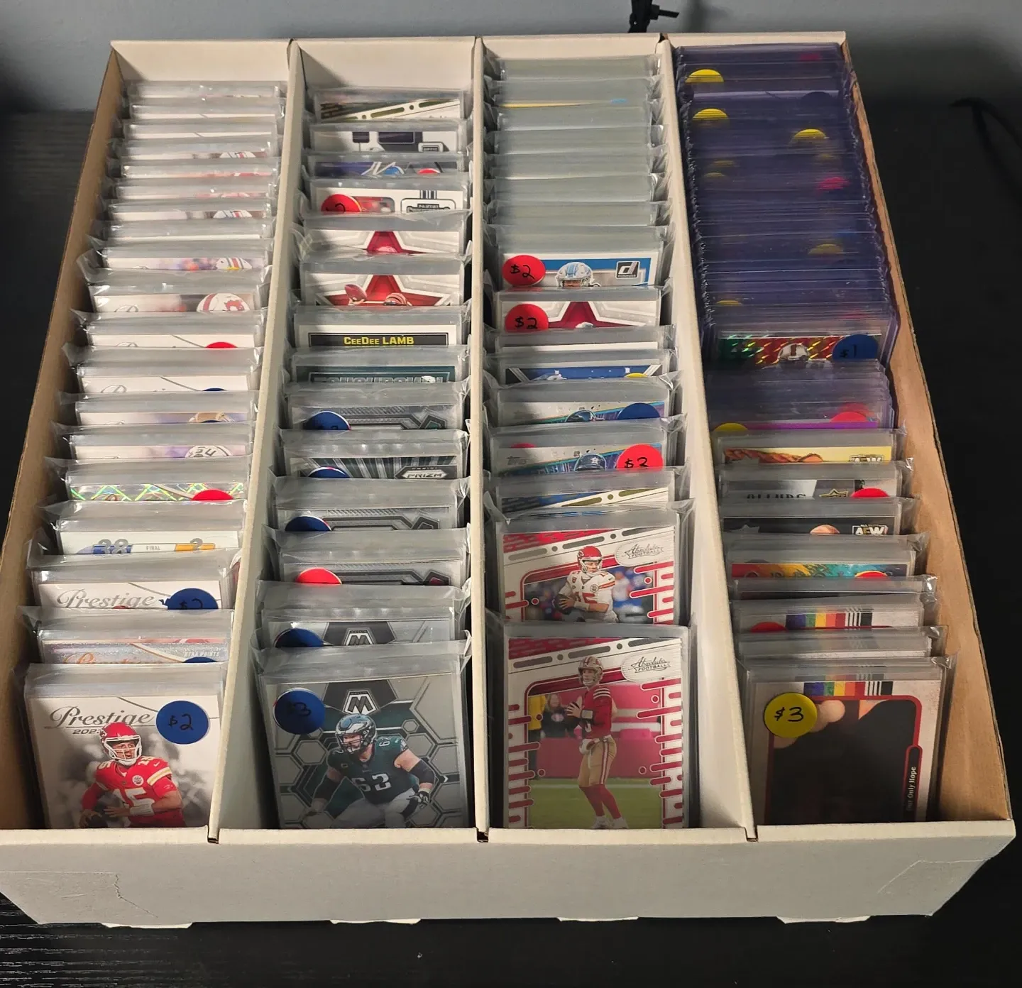 This is a collection of various sports trading cards, including football and possibly other sports. There are even stranger things trading cards as well. Cards are sleeved and organized in a storage box. Some cards have price stickers indicating $1 - $3.