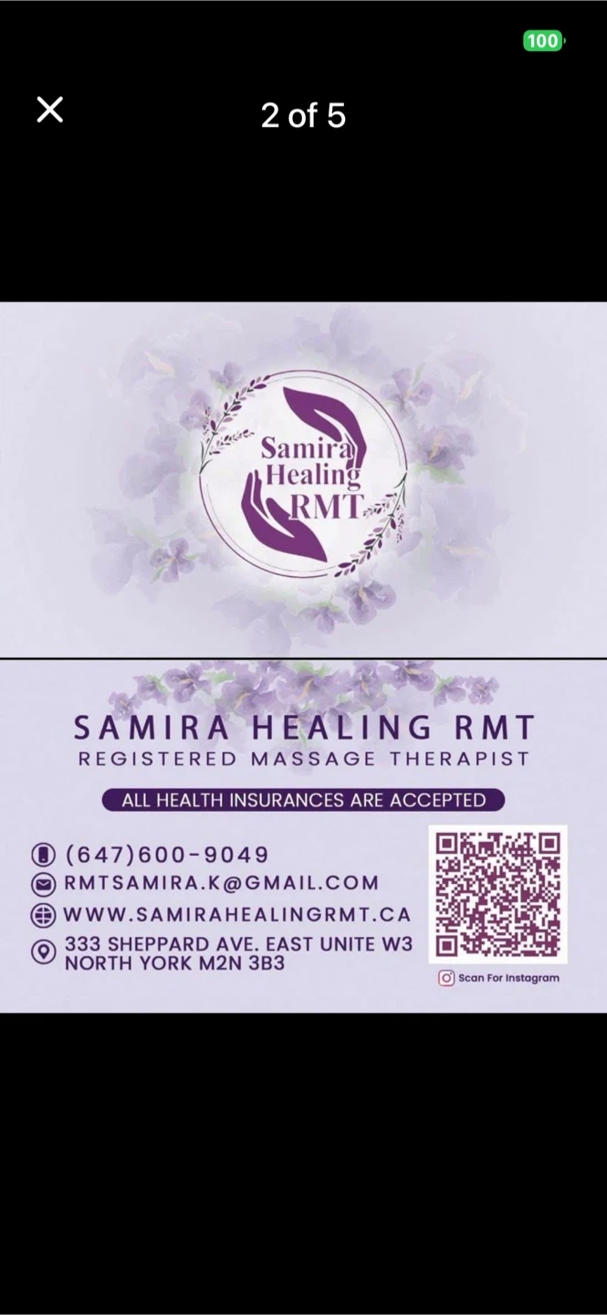 Samira Healing RMT, a registered massage therapist located in North York. All health insurances are accepted. Contact at (647) 600-9049 or visit www.samirahealingrmt.ca