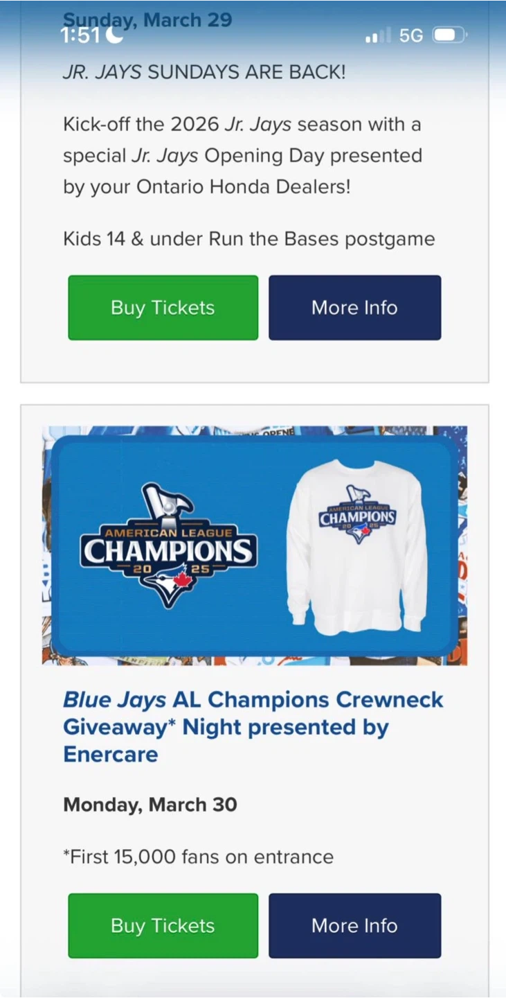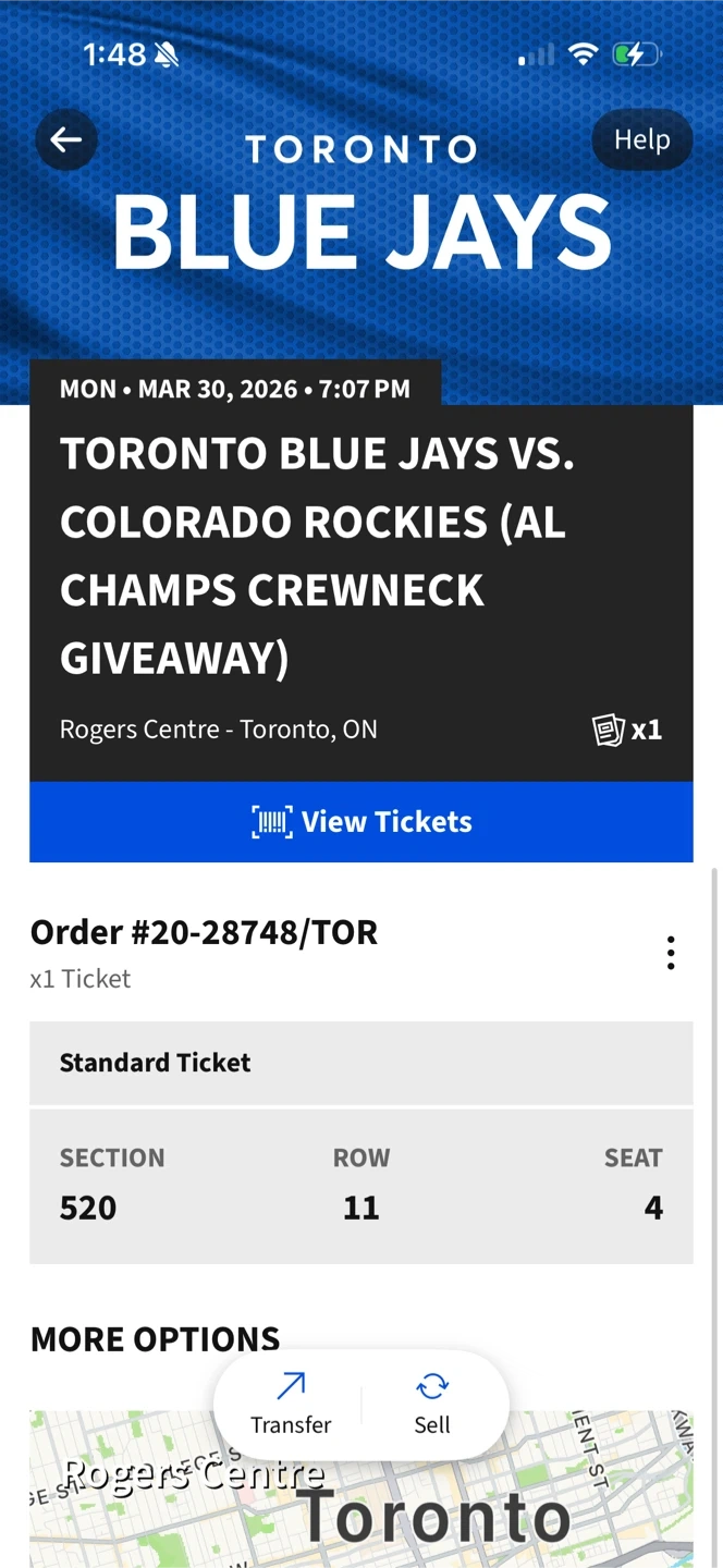 I have a single ticket to a blue jays game my sister got me one ticket for myself but I can't make it to the game, it's is a give away game so if you are one of the first 1500 people in the stadium you can get a free Blue jays ALC crewneck sweatshirt! The ticket is on ticket master and I will be able to transfer to you.