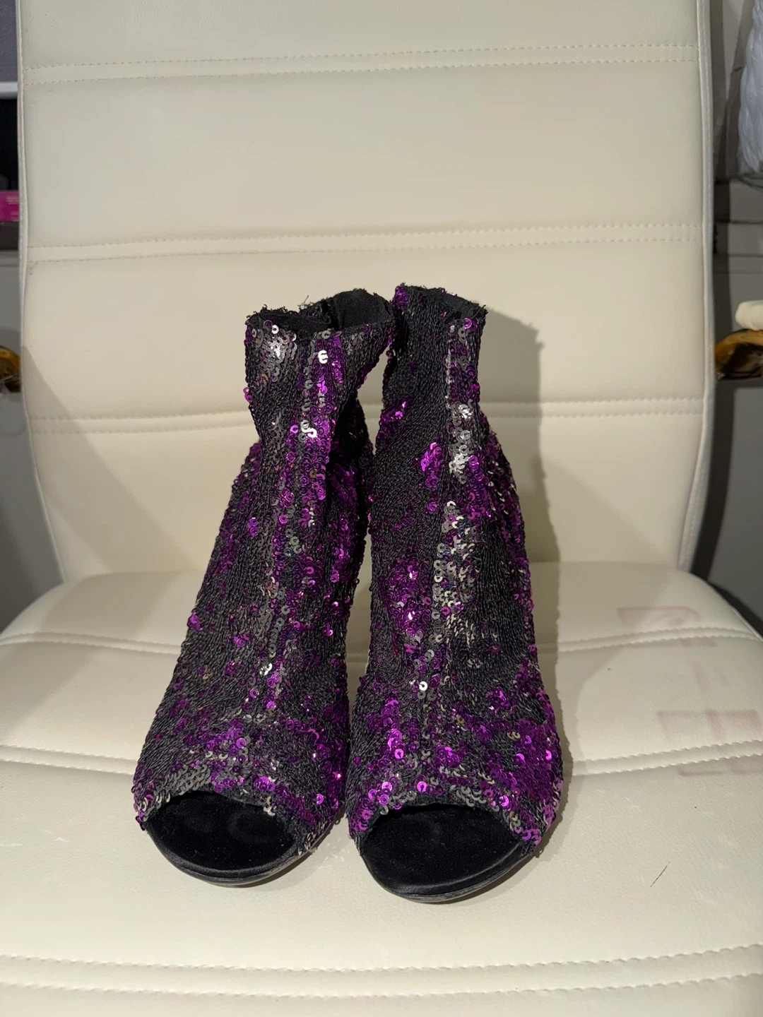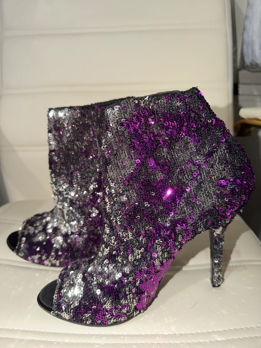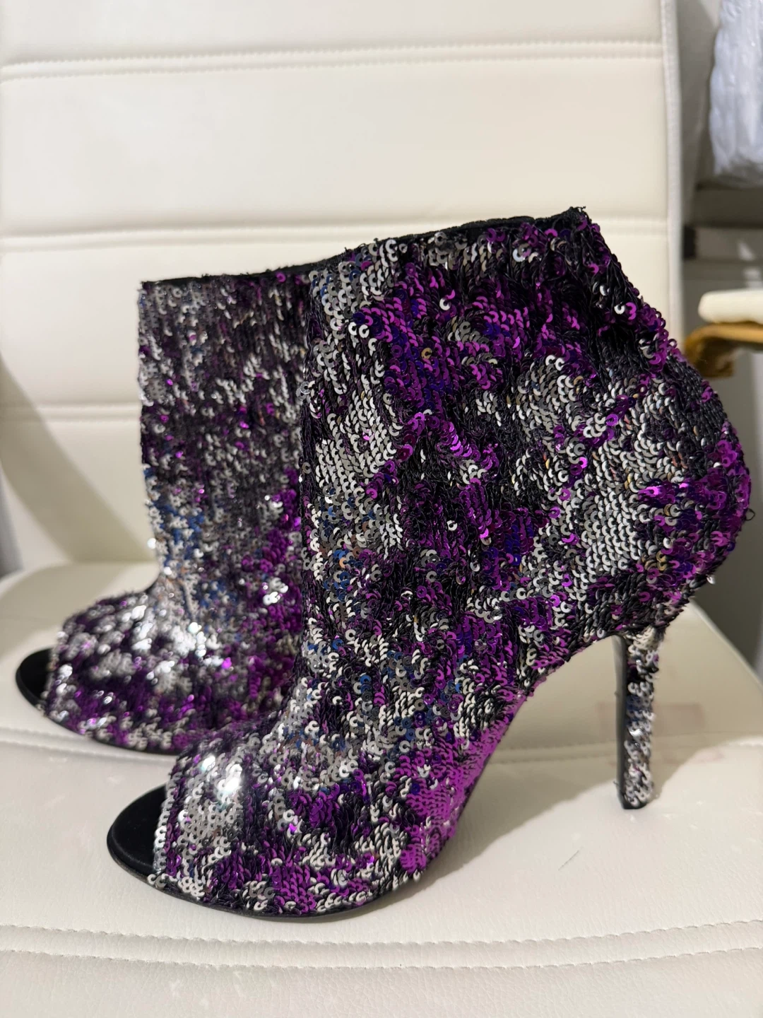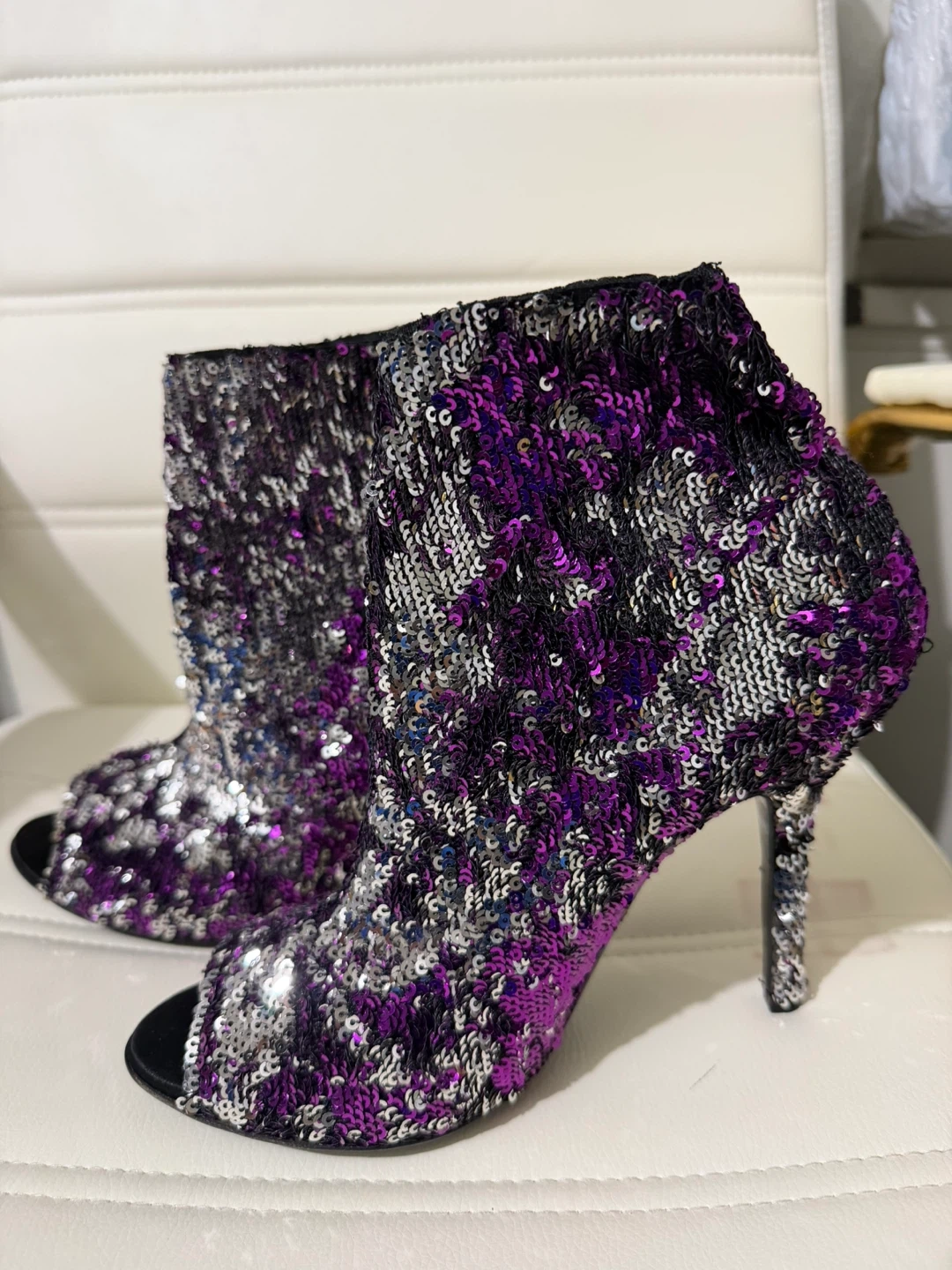 Sparkling booties covered in purple and silver sequins. Features a peep-toe design and stiletto heel. Perfect for a night out or special occasion!