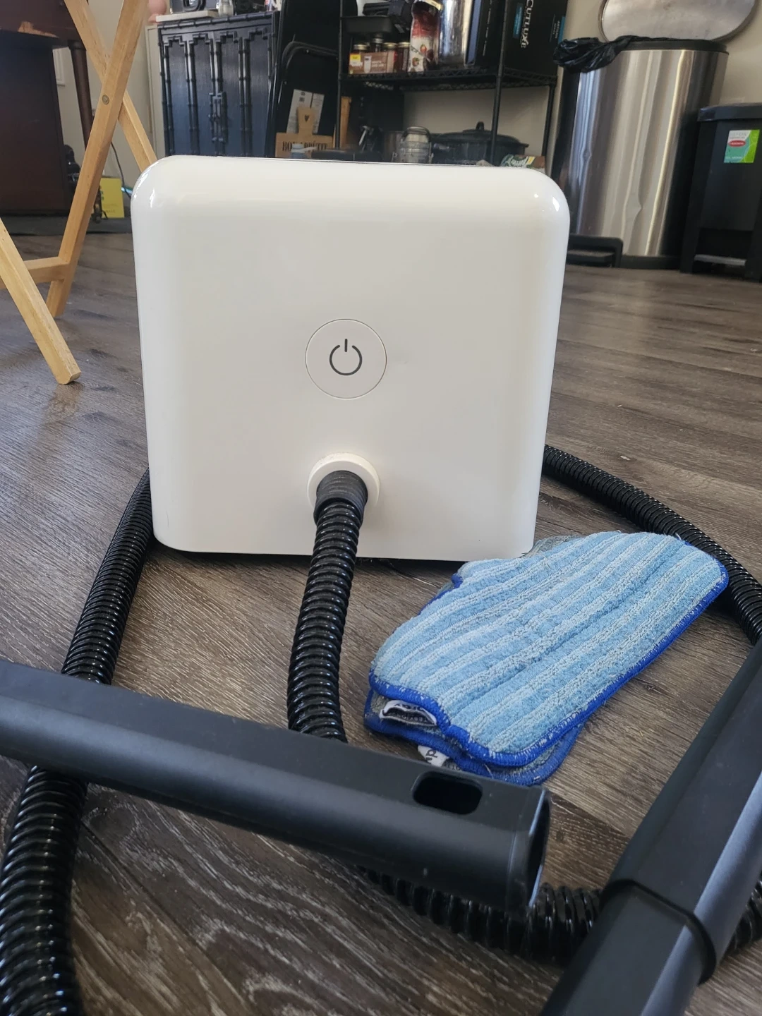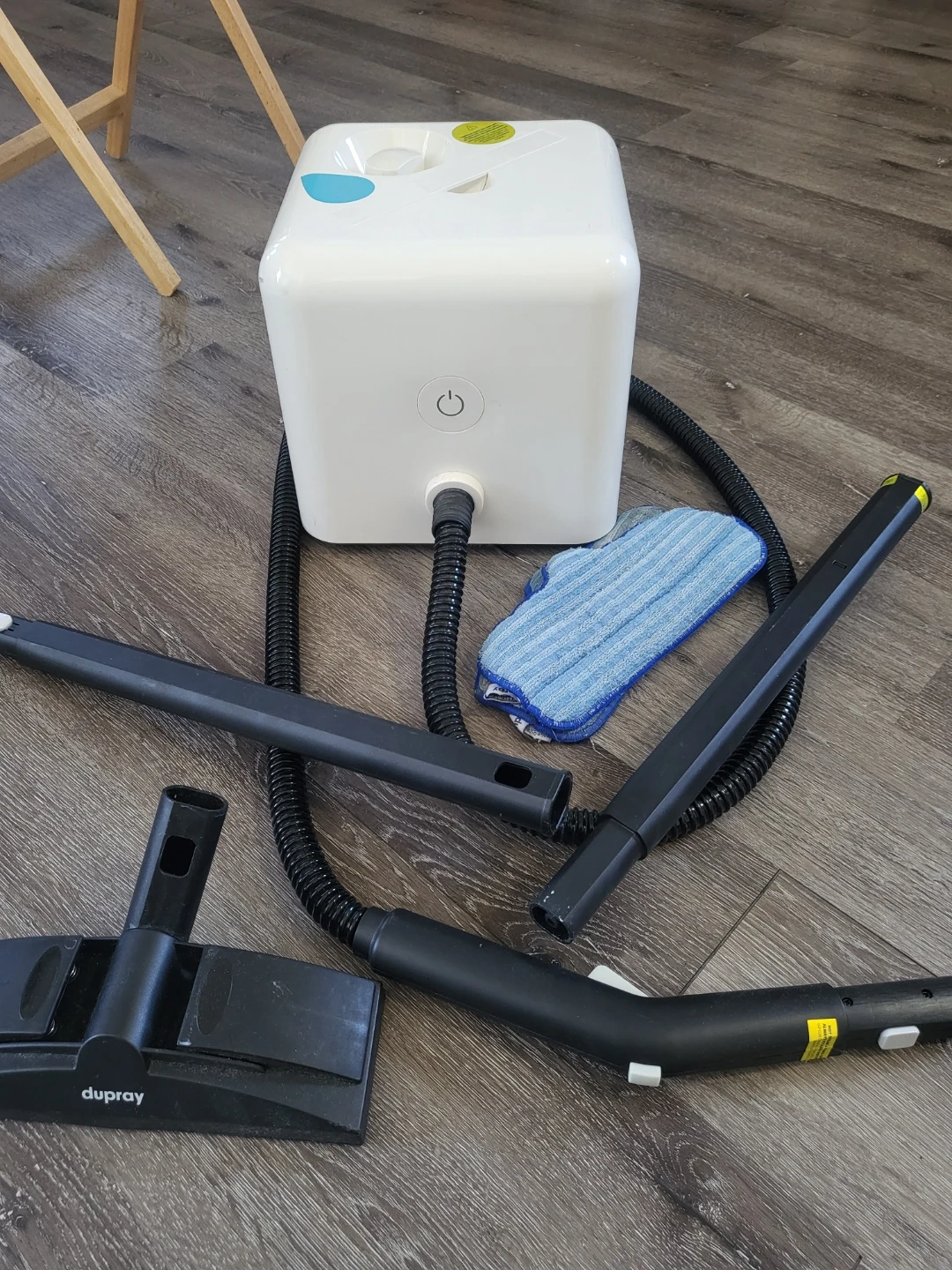 This Dupray steam cleaner comes with a hose, extension wands, and a microfiber pad for cleaning. It's a compact unit designed for versatile use. Hold the steam trigger during use to keep the steam flowing faster!