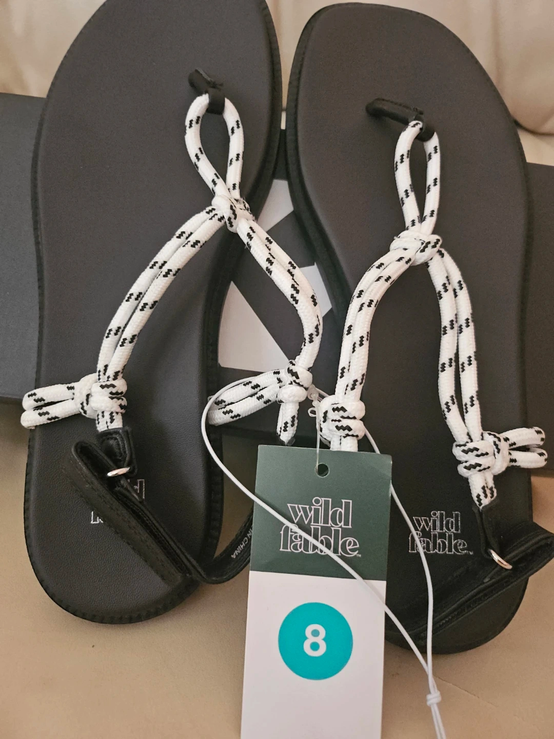 These Wild Fable black flip-flop sandals feature a stylish rope strap design. Size 8. Perfect for casual summer wear!