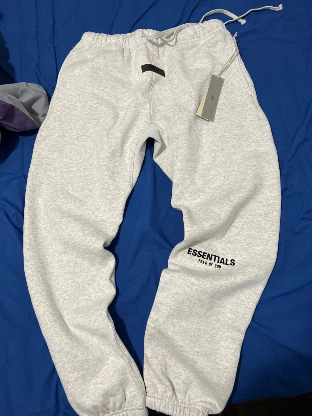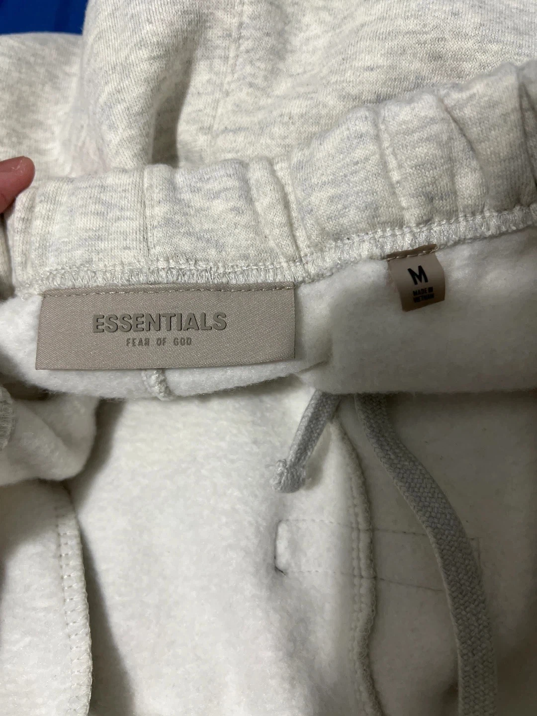 These light grey sweatpants are from the brand Fear of God Essentials. They're a size medium with an elastic waistband and drawstring. Made from a soft, cozy material.