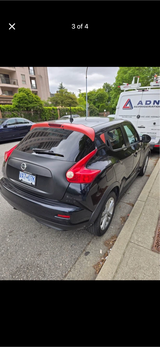 Black Nissan Juke. This compact crossover offers a stylish design and comfortable ride. It's a great option for city driving and everyday errands. Comes with alloy wheels and a black exterior with red accents on the roof spoiler and mirror caps.