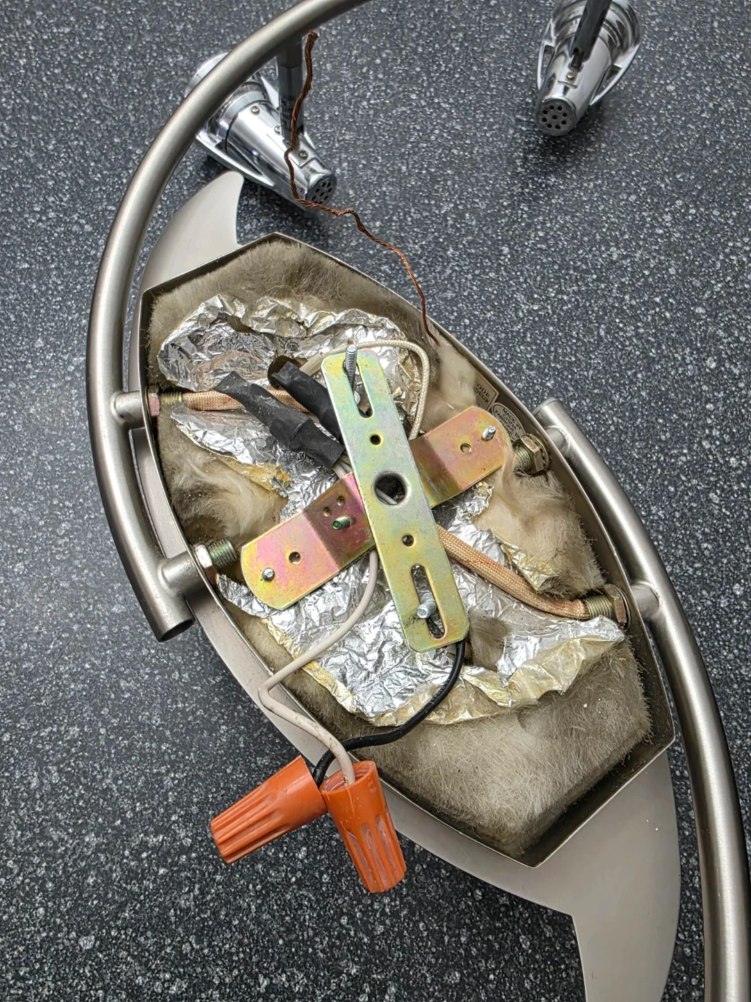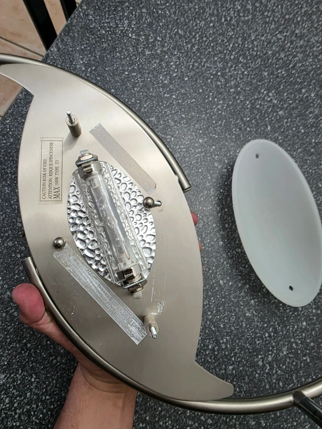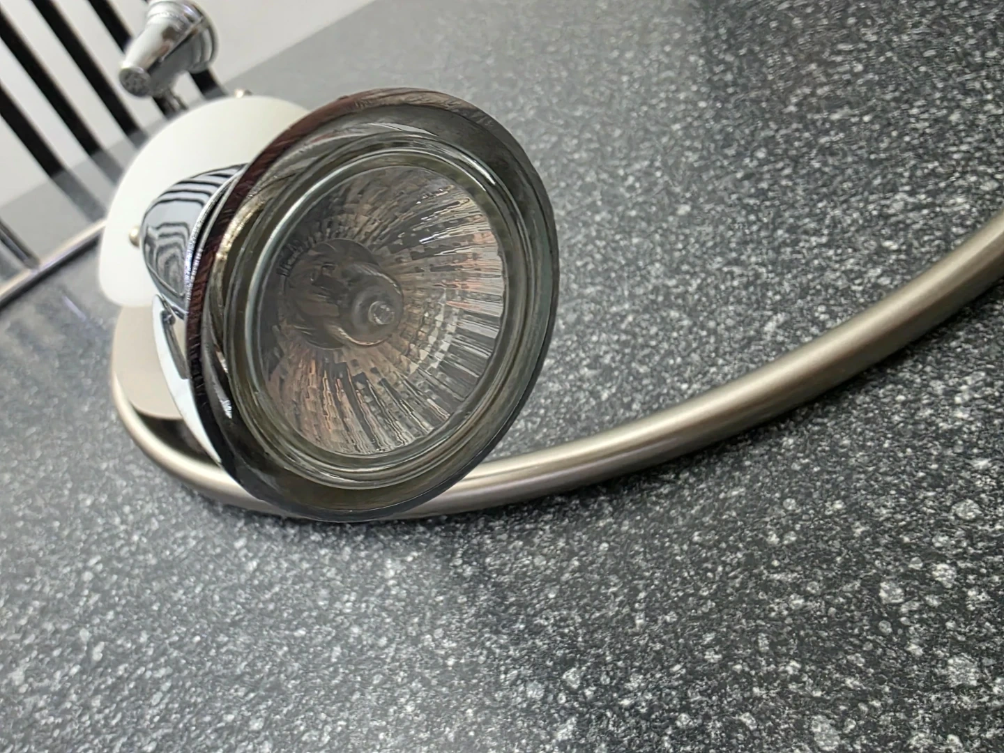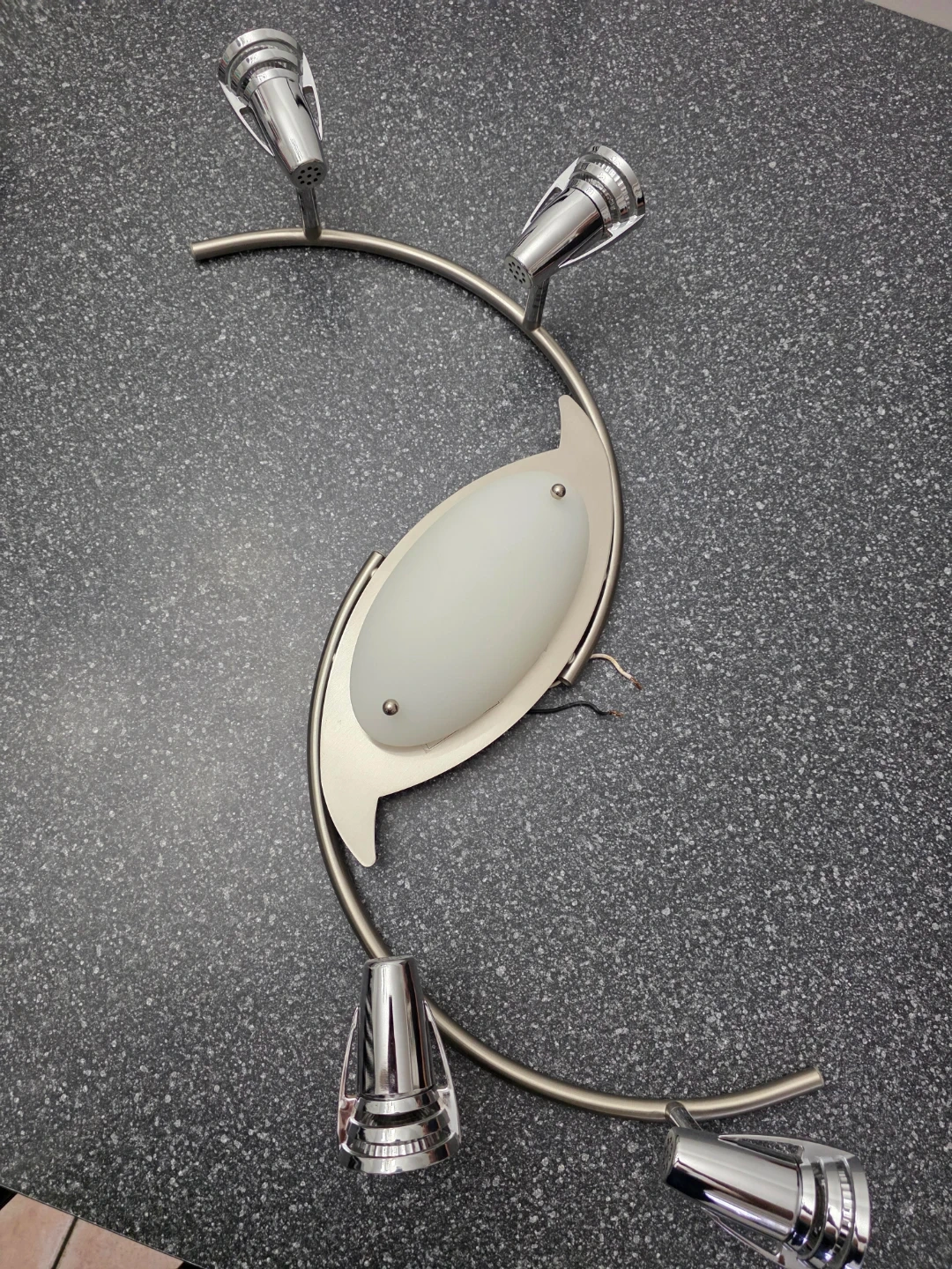 This brushed nickel track lighting fixture features a stylish swirl design with four adjustable spotlight heads. It includes a frosted glass centre light cover and is designed for 120V, Type T3 bulbs. The fixture's metal construction ensures durability. Used but still in great condition.