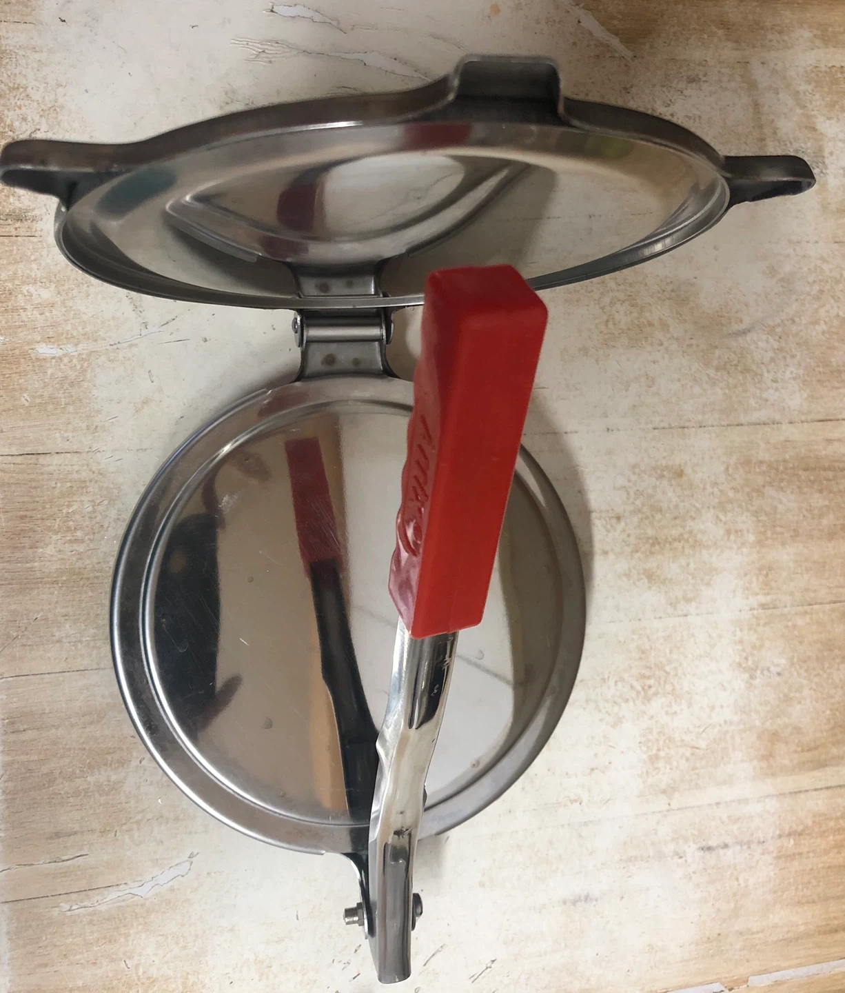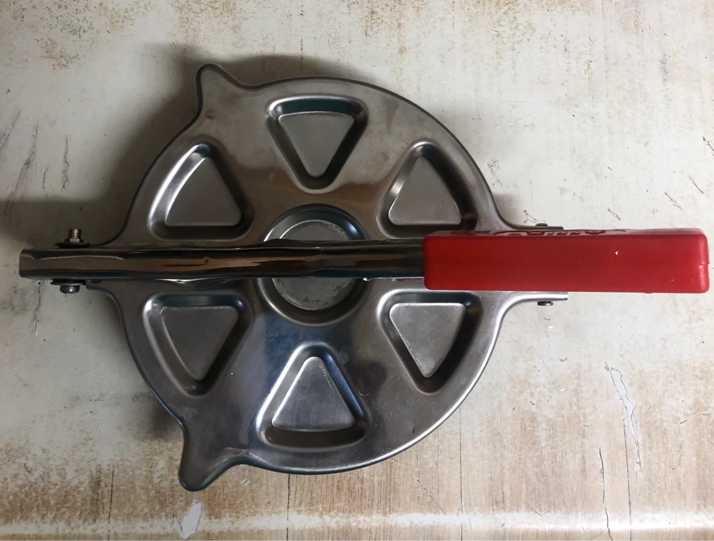 This is a vintage stainless steel pie press. It's made with a durable metal construction and a bright red handle. The press creates six individual pie pockets.
