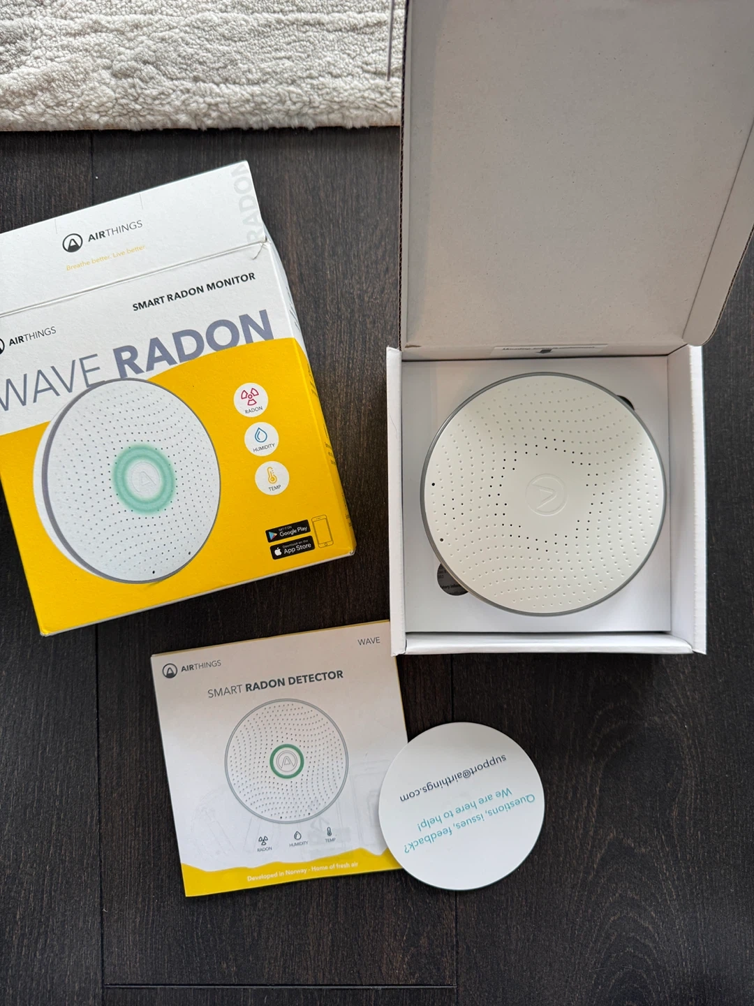 This is an Airthings Wave Radon smart radon monitor and detector. It measures radon, humidity, and temperature. The device was developed in Norway.