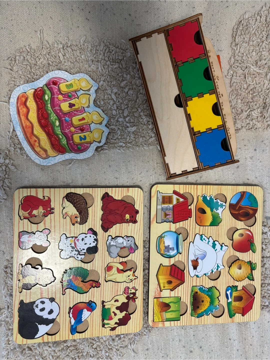 This wooden toy set includes a shape sorter with coloured pieces and multiple wooden puzzle boards featuring animals and scenes. It's great for developing fine motor skills and recognition for young children. Made from high quality durable wood.