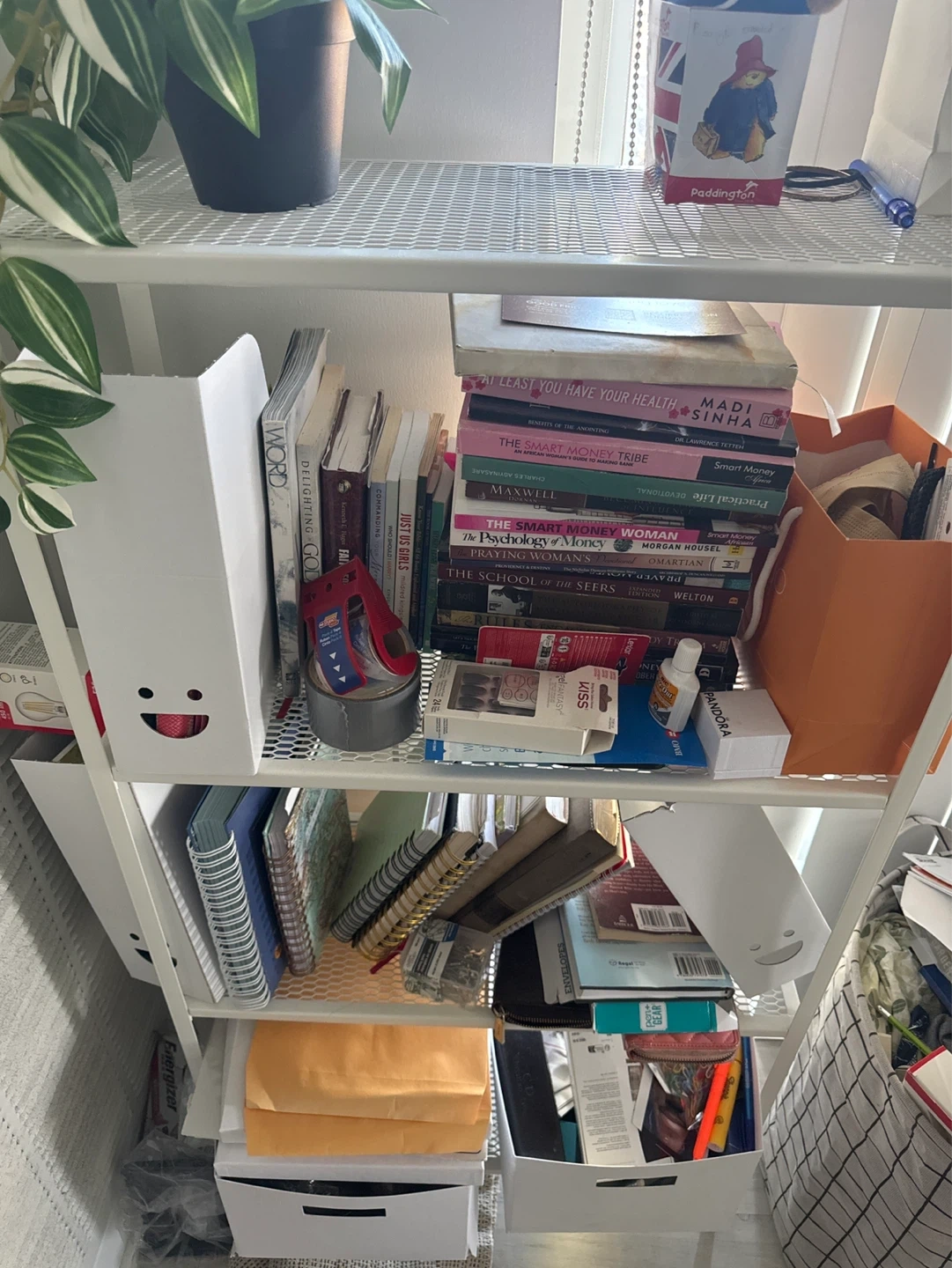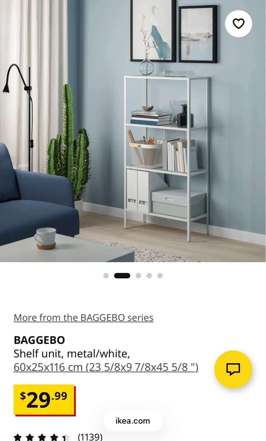 This is an IKEA BAGGEBO shelf unit in white metal. Its dimensions are 60x25x116 cm. It's a tall, narrow unit with four shelves. It's useful for storing books, binders, or decorative items.