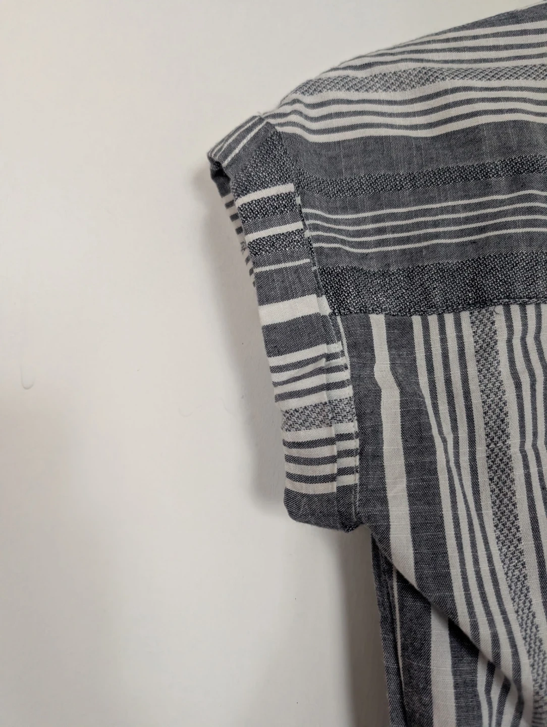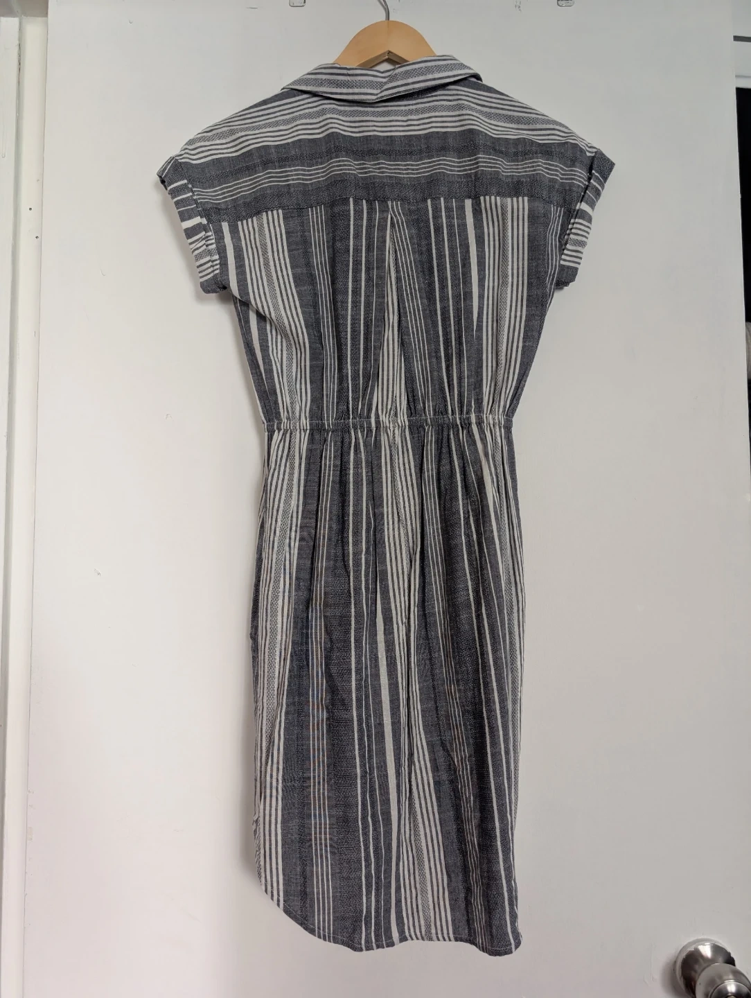 This Japna dress features a stylish grey and white stripe pattern. It's made from a 60% cotton and 40% rayon blend. The dress is a size small with short sleeves and a tie waist. It comes with two button-flap chest pockets.