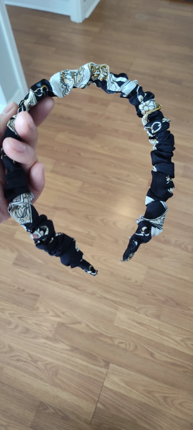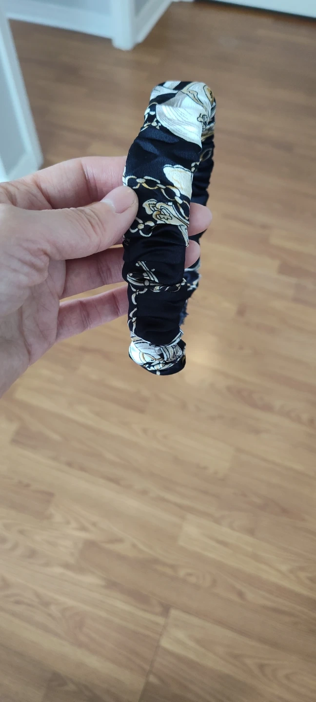Stylish headband with a black background and a white chain-link pattern. It's fabric-covered and has a gathered, ruched design. This accessory adds a touch of flair to any hairstyle!