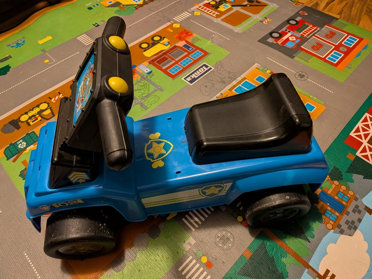 A blue Paw Patrol ride-on car featuring Chase. It's a fun toy for kids who love Paw Patrol adventures. Perfect for imaginative play and developing motor skills! Plays a song and starting sound.