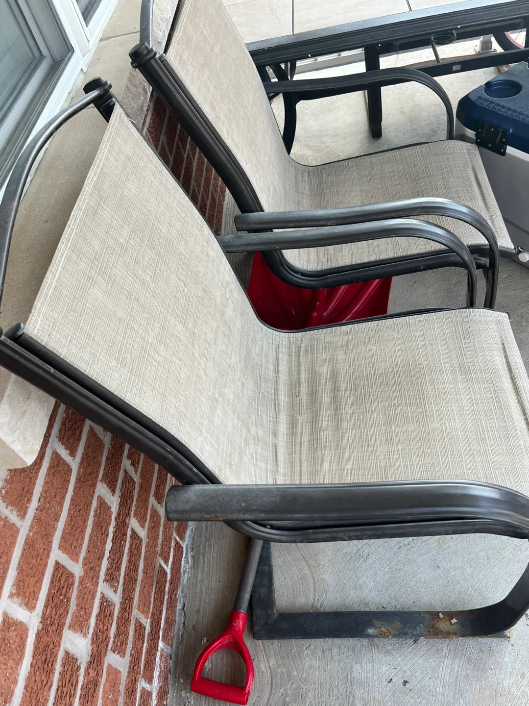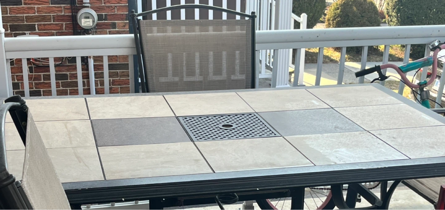 This set includes six chairs and one patio table. The chairs have a metal frame with a woven fabric seat and back. The table features a tile top with a metal frame.