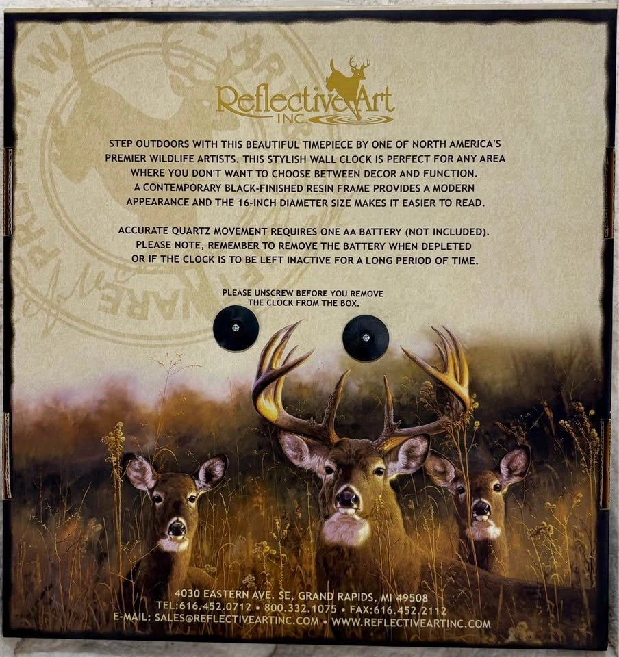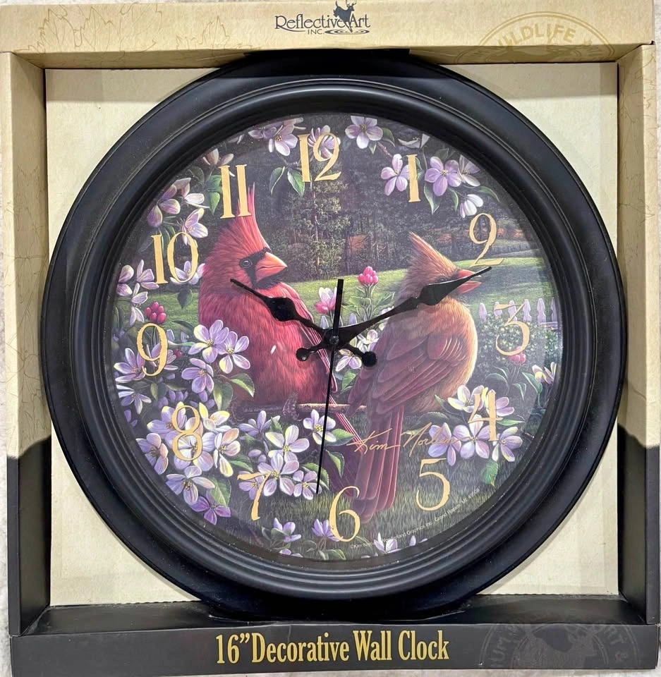 Beautiful new wall clock from Reflective Art. Features two cardinals and purple flowers. Black resin frame. Needs one AA battery, not included. Still in original box.