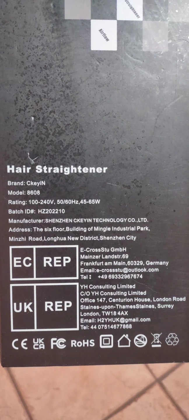 Brand new CkeyiN hair straightener, model 8608. It has intelligent temperature control and quick heat functionality. 60 minutes automatic shutdown protection.