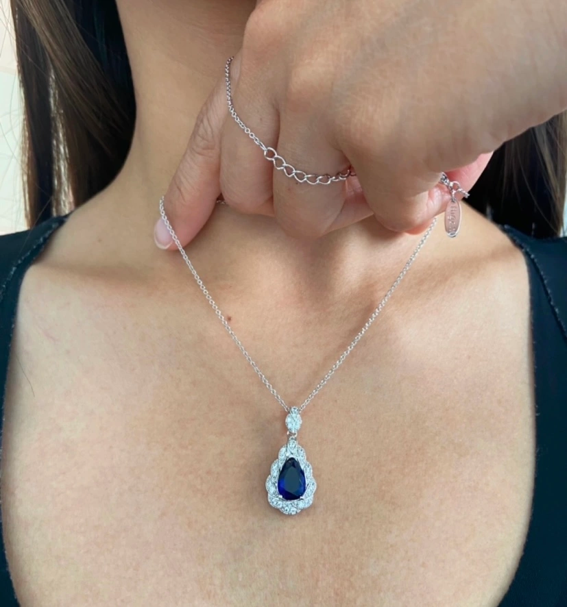 Beautiful silver pendant necklace featuring a pear-cut blue sapphire Color rhinestone surrounded by smaller clear stones. Makes a lovely accessory for any occasion!