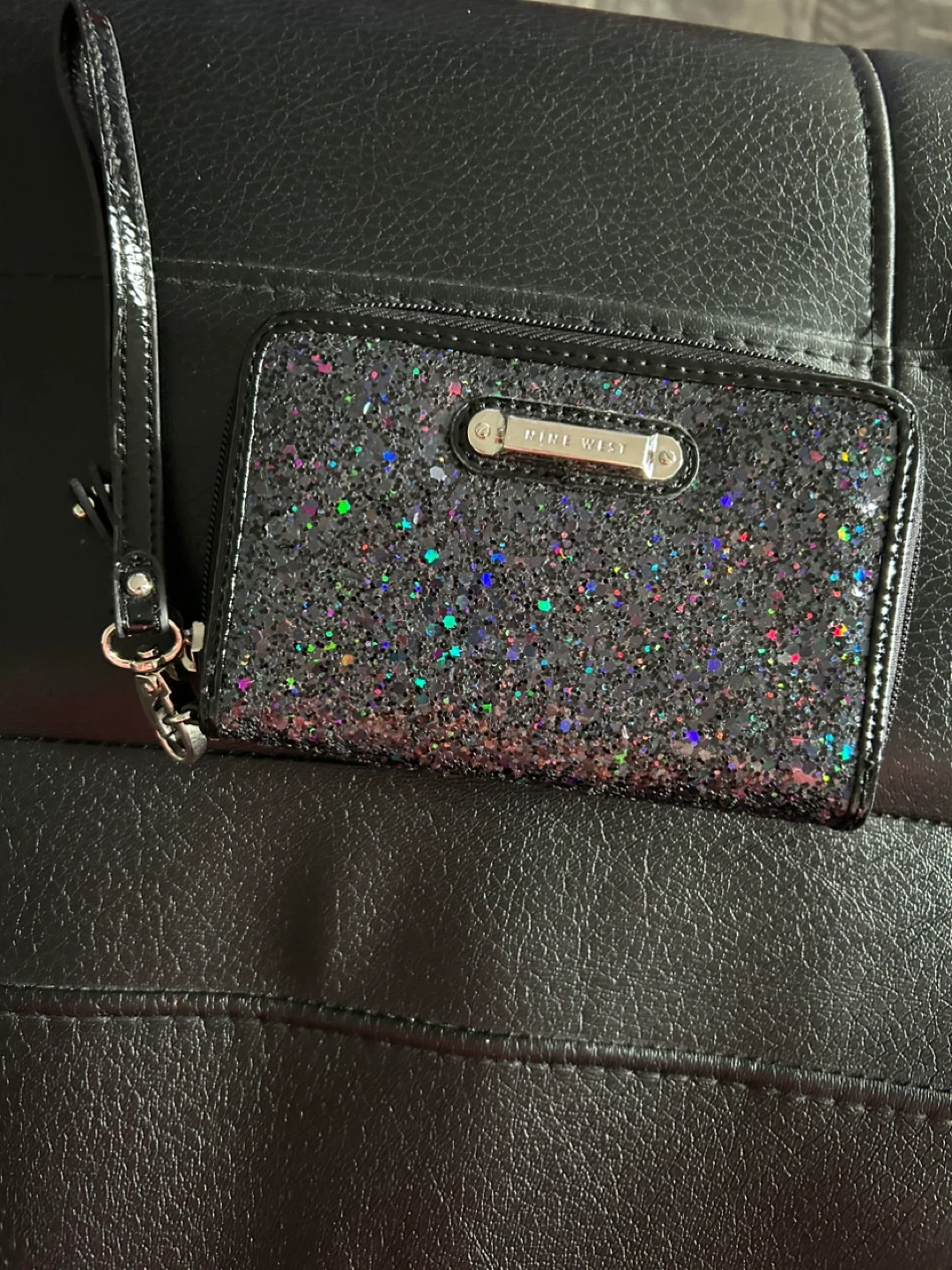 This Nine West wristlet wallet features a sparkly black glitter design. It includes a convenient wrist strap for easy carrying. The compact size makes it great for essentials! I invite you to view my other items; if you are interested in any of them, I will give you a better price.