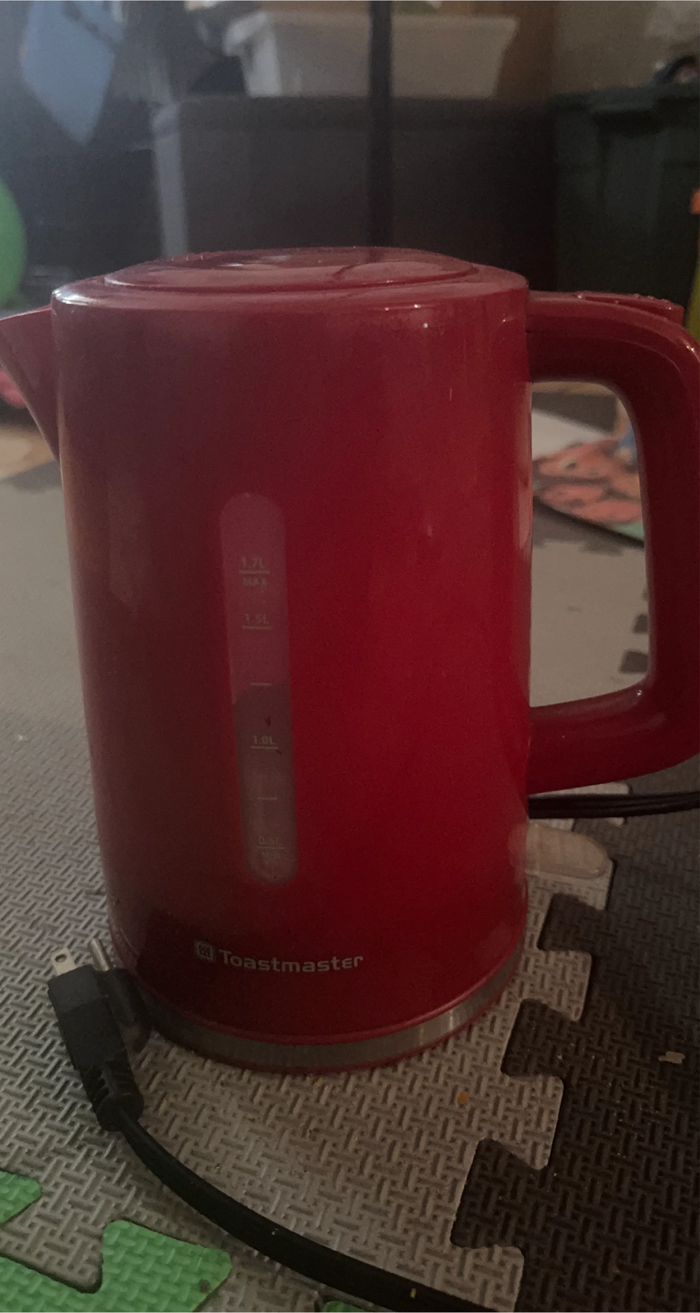 Toastmaster electric kettle in a bright red colour. It has a water level indicator and a capacity of 1.7L. Perfect for quickly boiling water for tea or coffee.