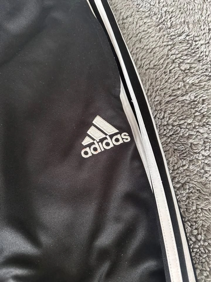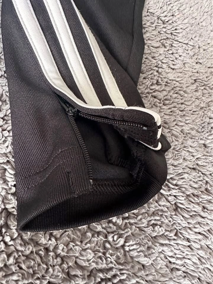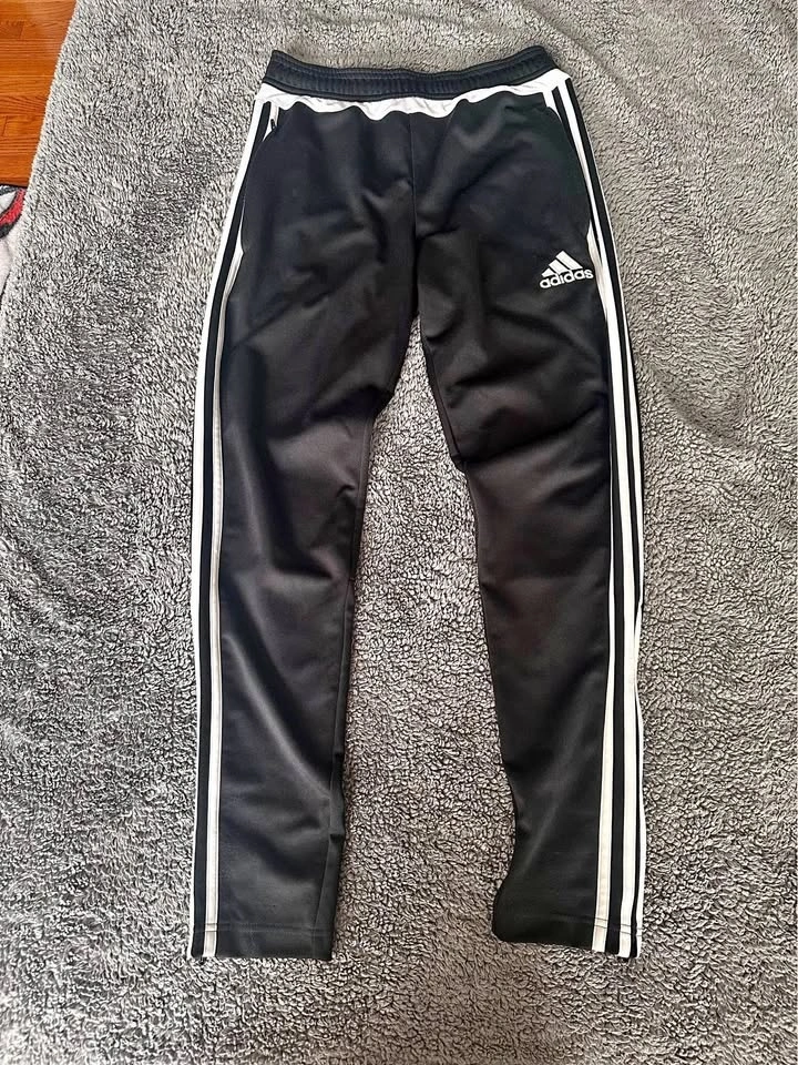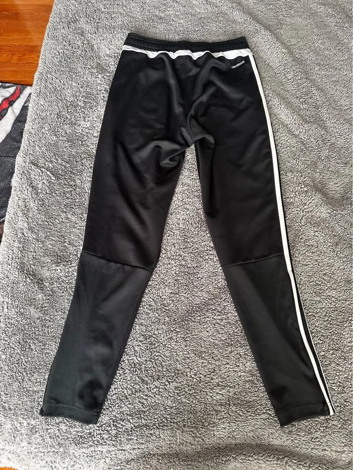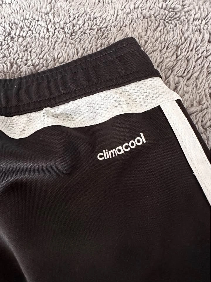Brand: Adidas. Technology: CLIMACOOL (Breathable and moisture-wicking). Design: Black pants with white stripes and logo, zippered pockets. Condition: Excellent Condition. Size: Tag says Small (S), but they are known to run a bit large and can comfortably fit a Medium (M).