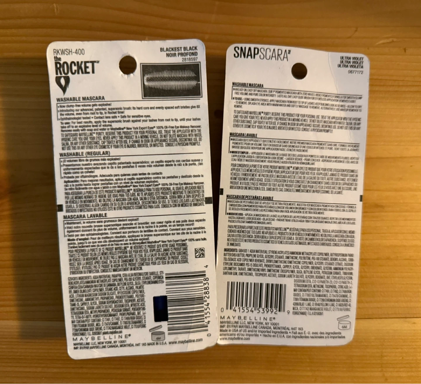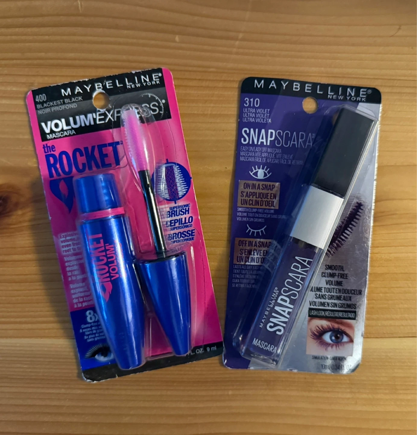 Two Maybelline mascaras: Volume Express The Rocket in Blackest Black and Snapscara in Ultra Violet.