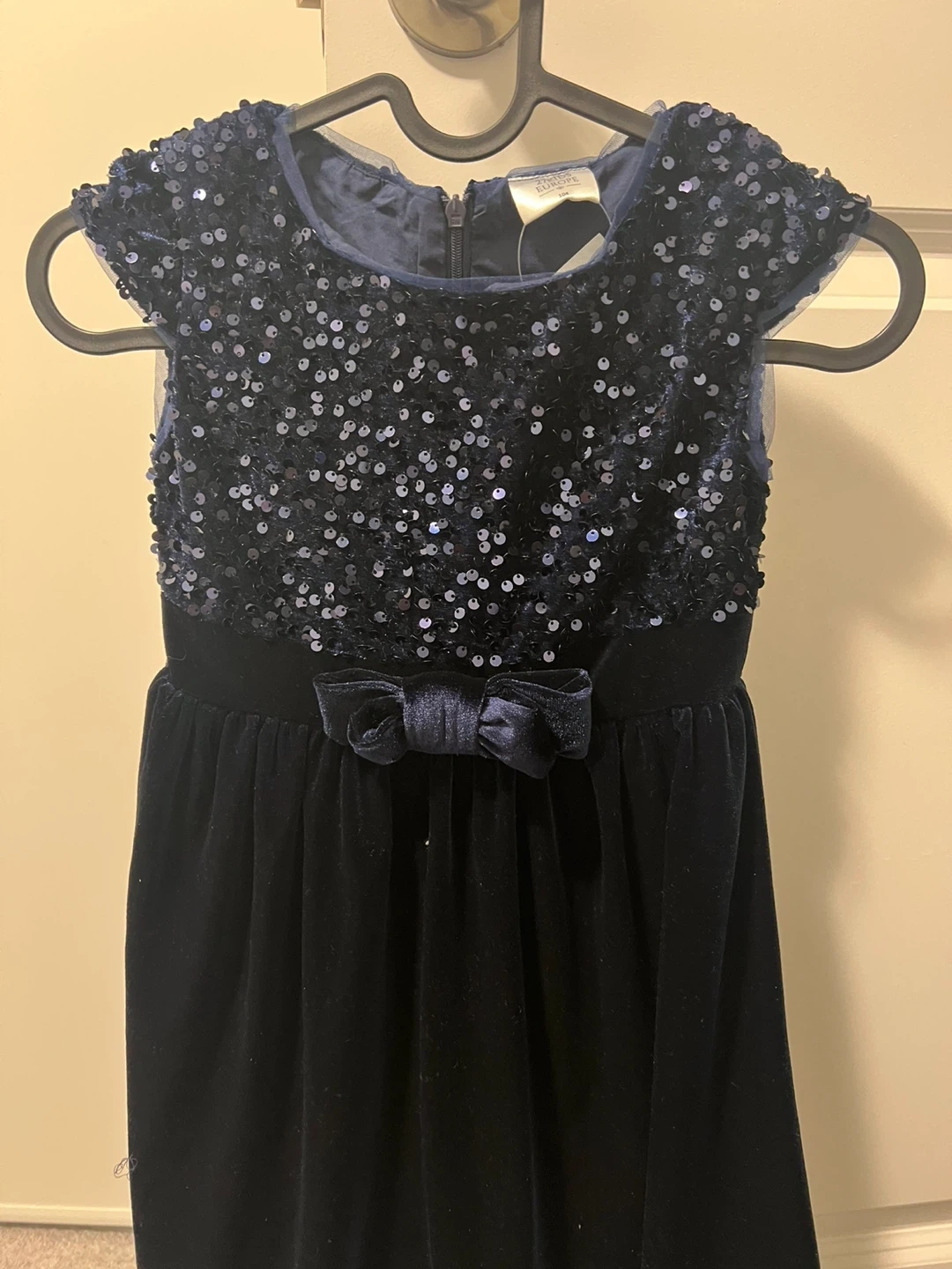 Navy blue velvet dress with sparkly sequin bodice and a satin bow accent. Cap sleeves and back zipper closure. Perfect for special occasions!