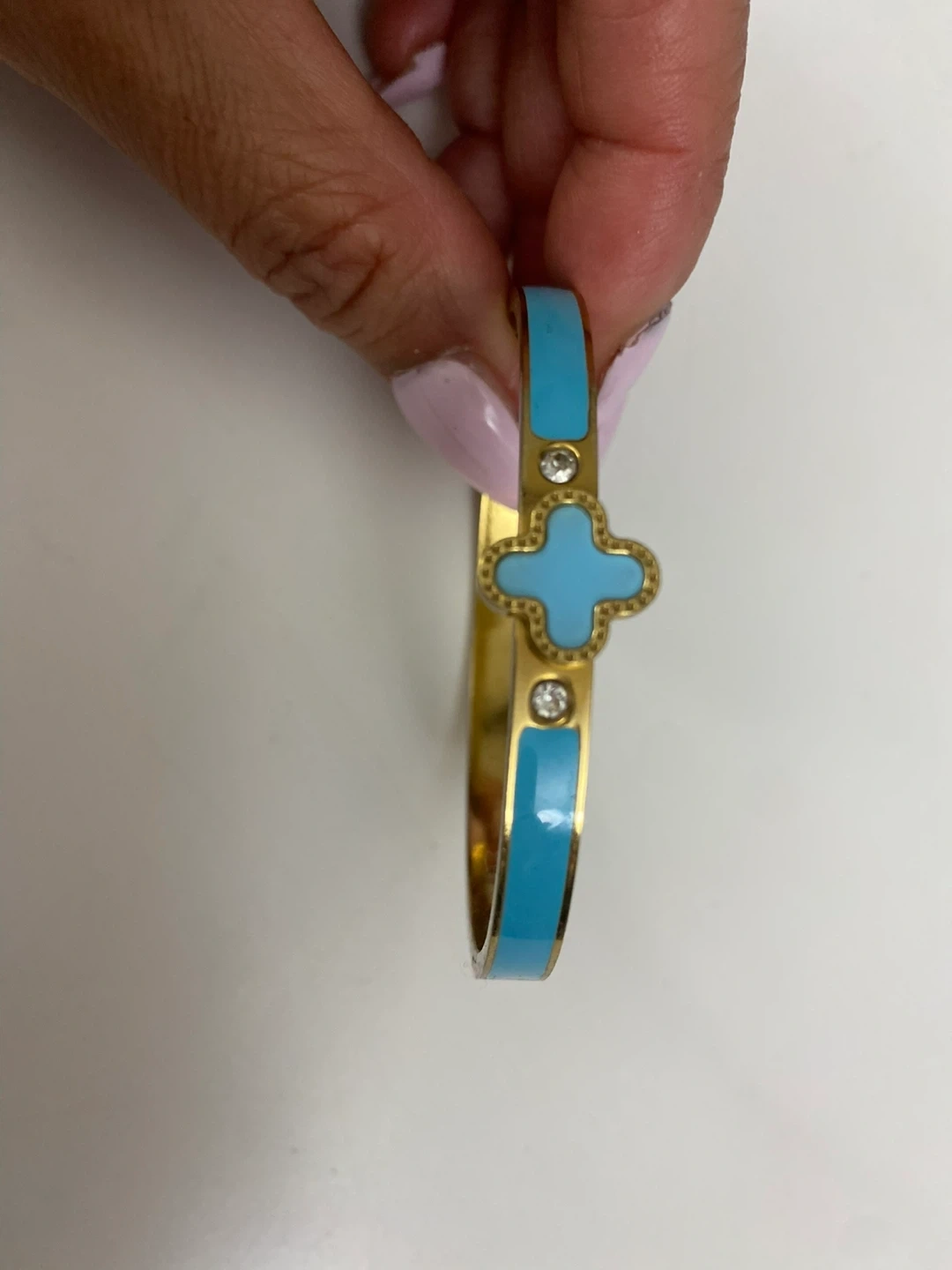 This is a gold tone bangle bracelet with a blue clover design. It features small clear accent stones. Its clasp closure makes it easy to wear. I got it as a gift, but not my style.