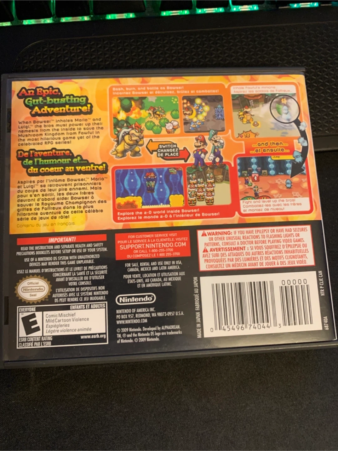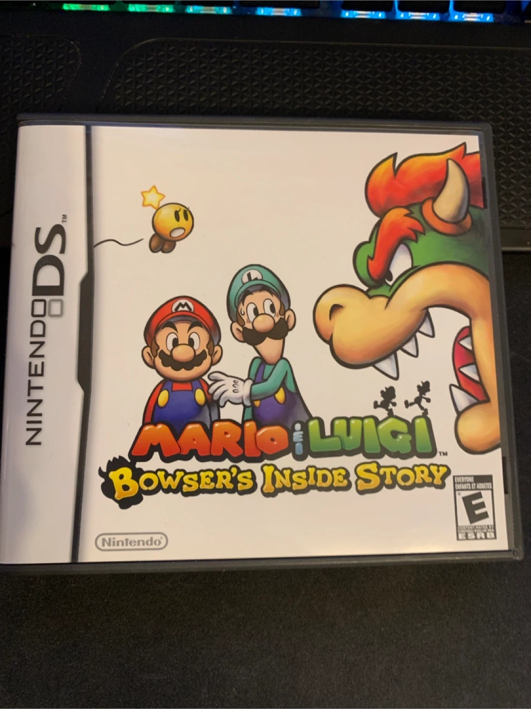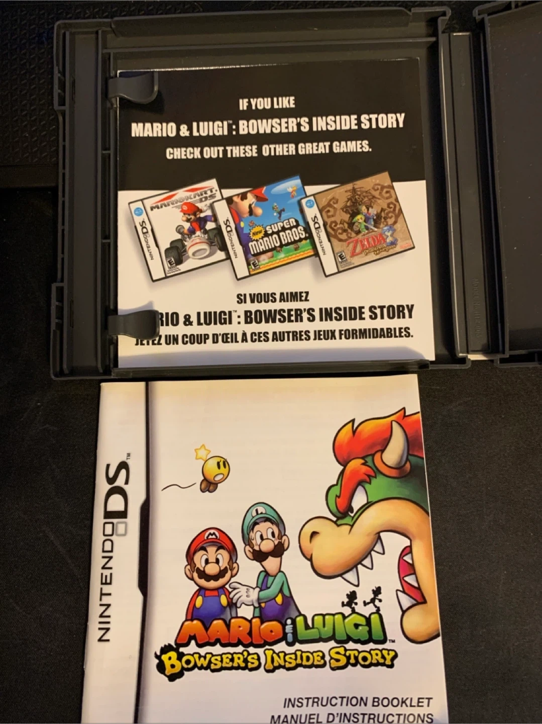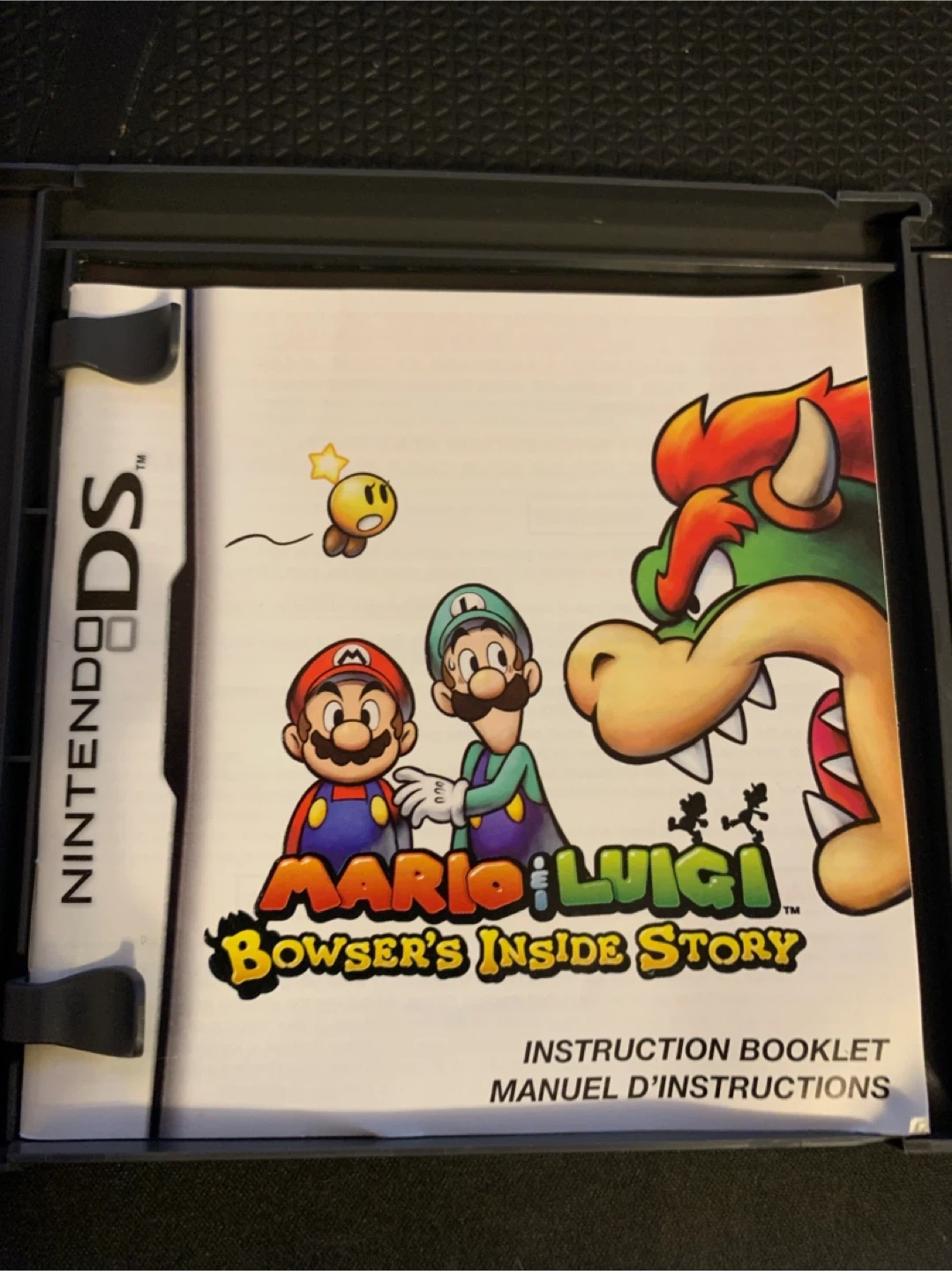 This game is Mario & Luigi: Bowser's Inside Story for the Nintendo DS. It's an action RPG where players explore the Mushroom Kingdom. Includes the game cartridge and instruction booklet.