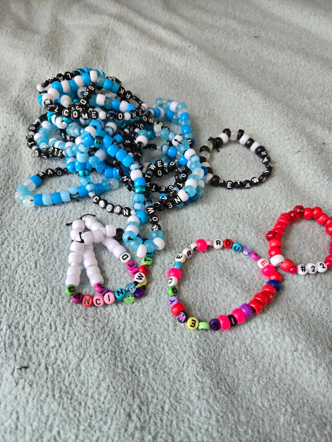 Bundle of handmade kandi bracelets with various words and phrases. Includes bracelets with 'Dancing', 'Welcome Soon', and '#22'. Made with colourful plastic beads.