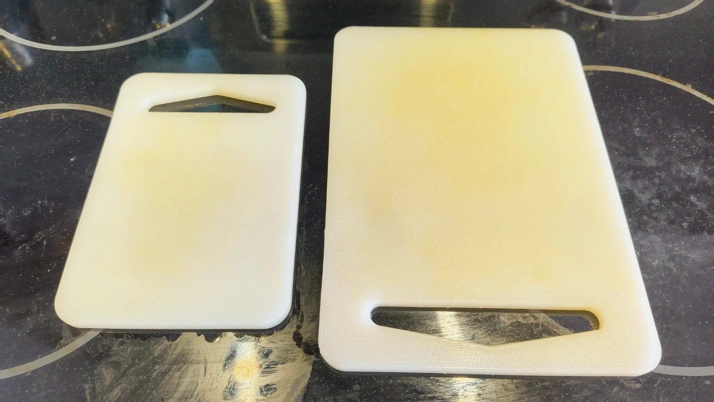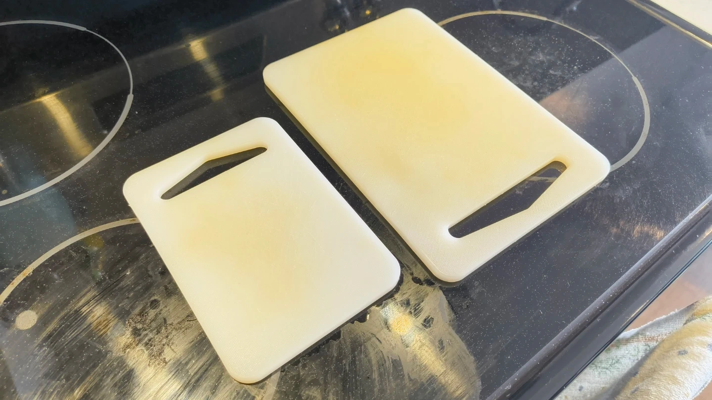 Two white plastic cutting boards are included. They're a simple kitchen tool for food prep. Strong Plastic material.