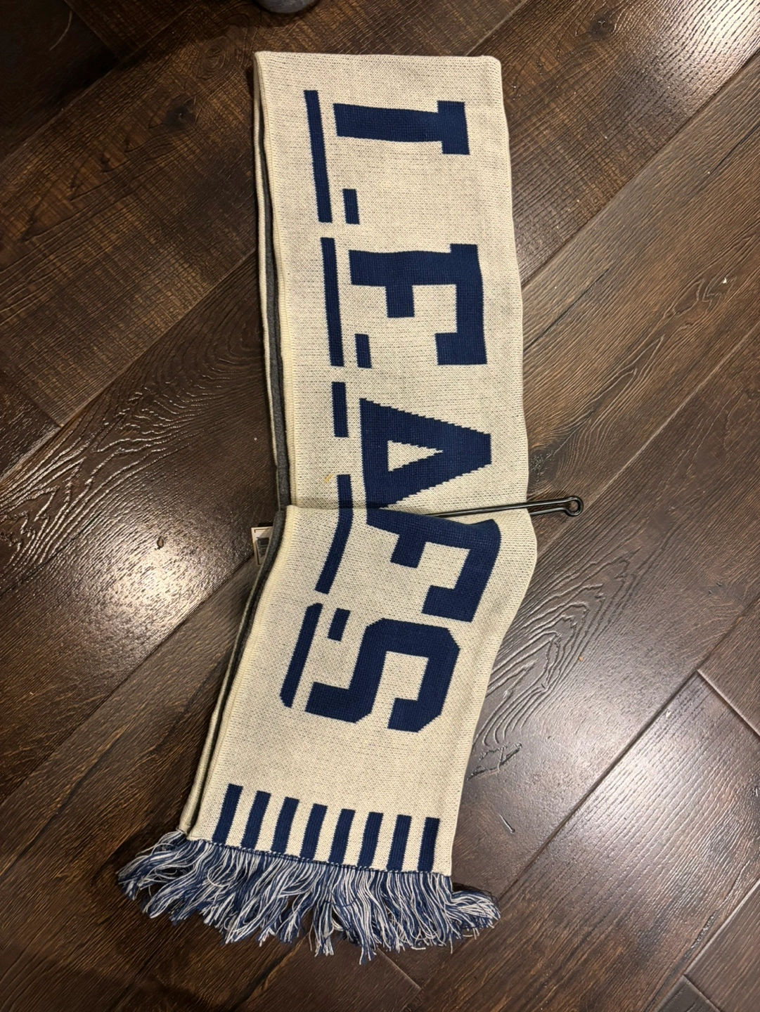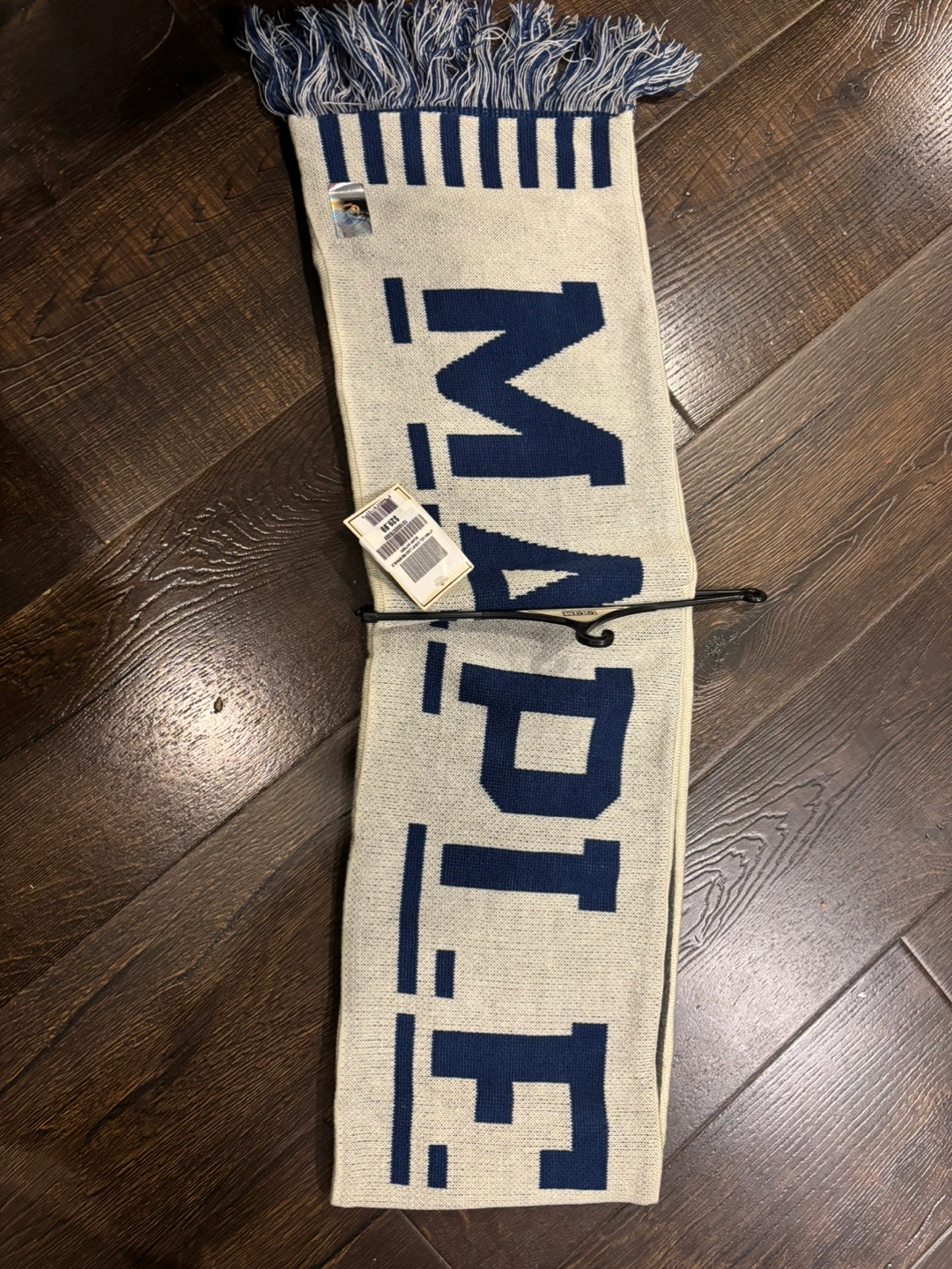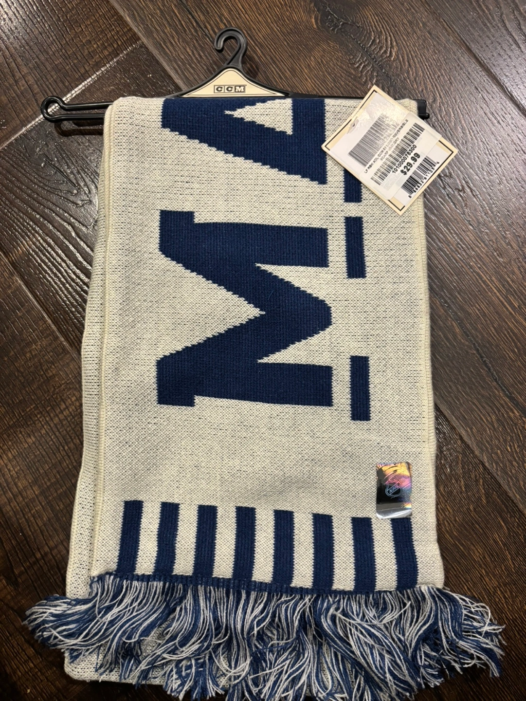 New with tags. Cream coloured knit scarf featuring the Maple Leafs logo. Features a fringed bottom. Pet free and smoke from home! Retails for $29.99 plus tax
