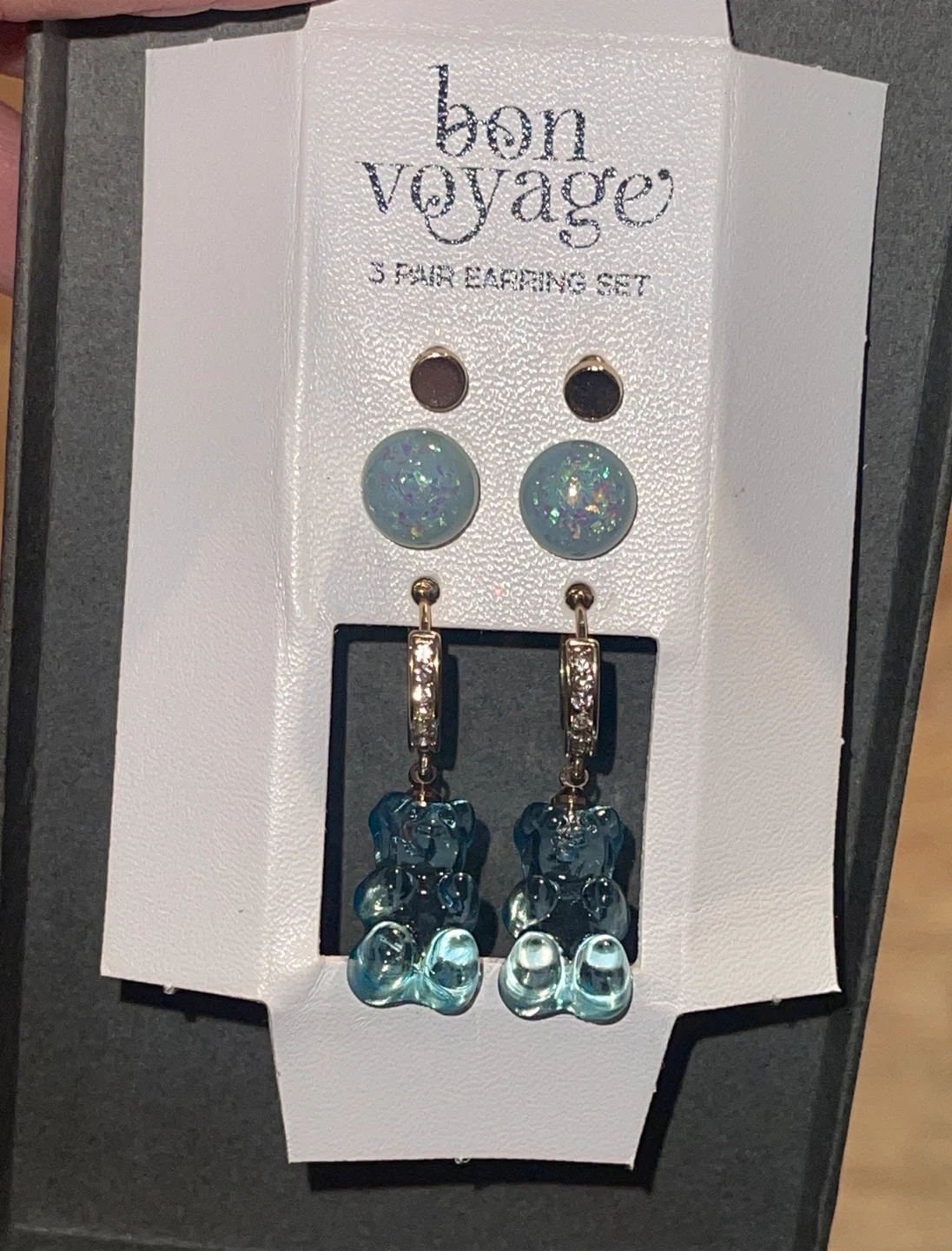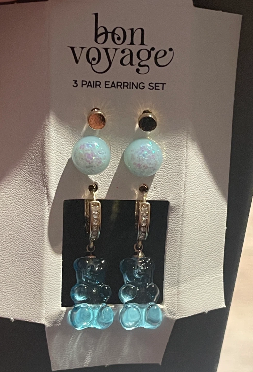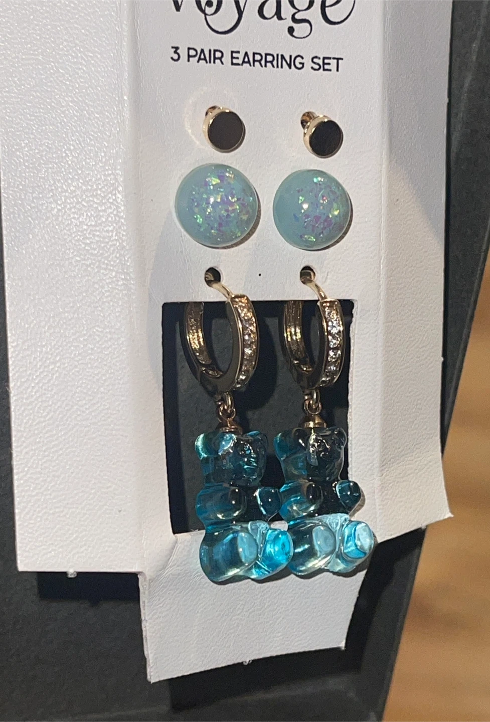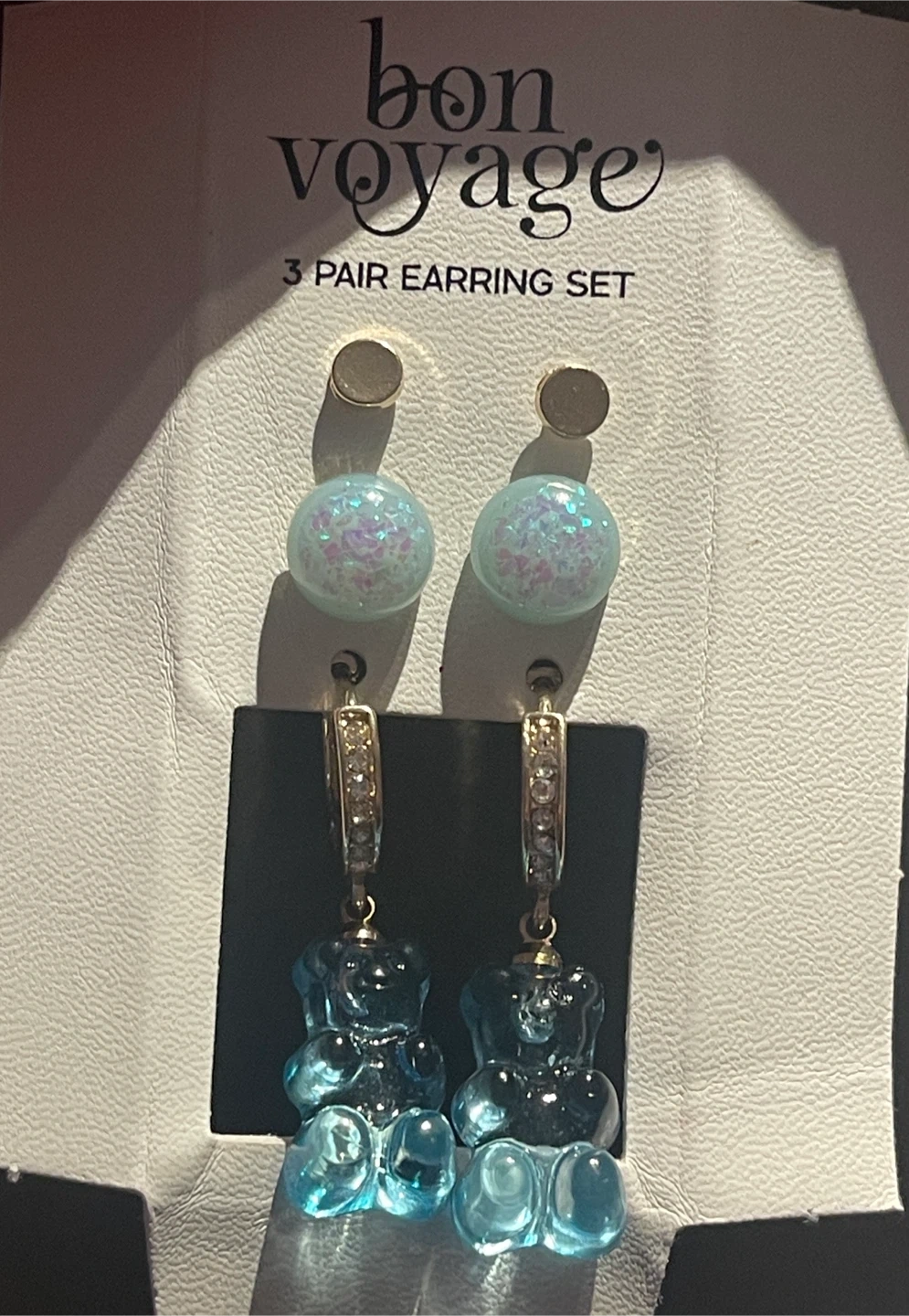 • Bottom: Blue gummy bear drop earrings hanging from gold-tone hoops accented with small crystals.