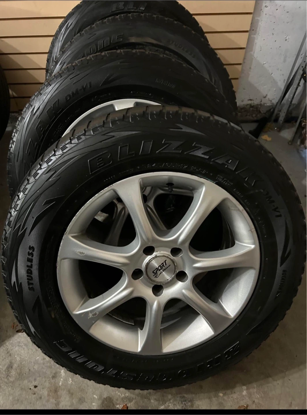 Four Bridgestone Blizzak studless tires mounted on Sport Edition alloy rims. Tire size is 245/65R17. These are winter tires. They're ready to go!