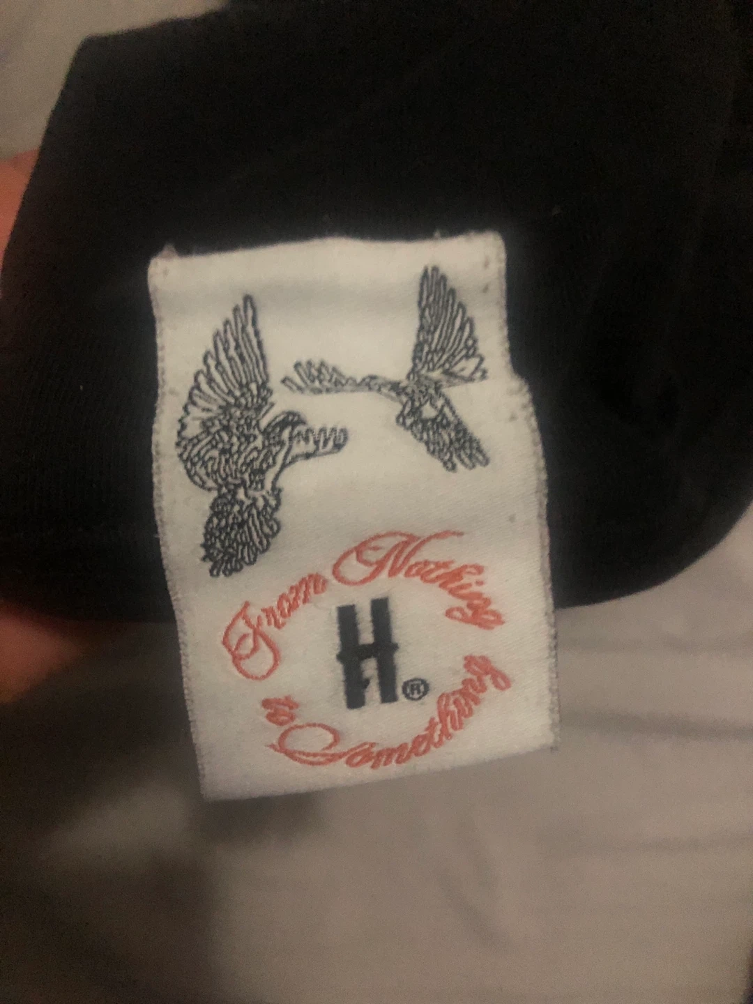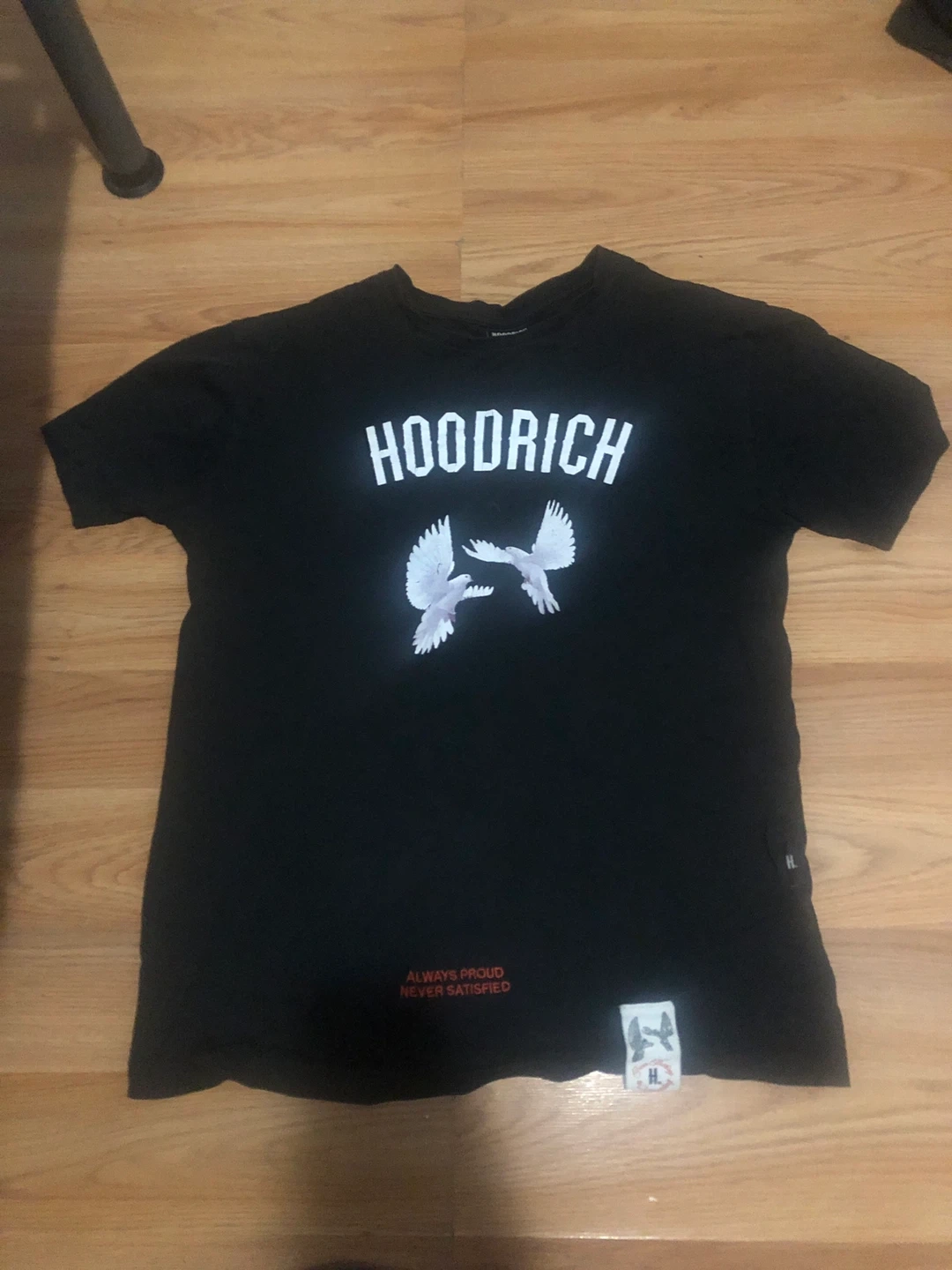 Black Hoodrich t-shirt with a dove graphic on the front. It's size small. Product of the Streets, Est. 2014.