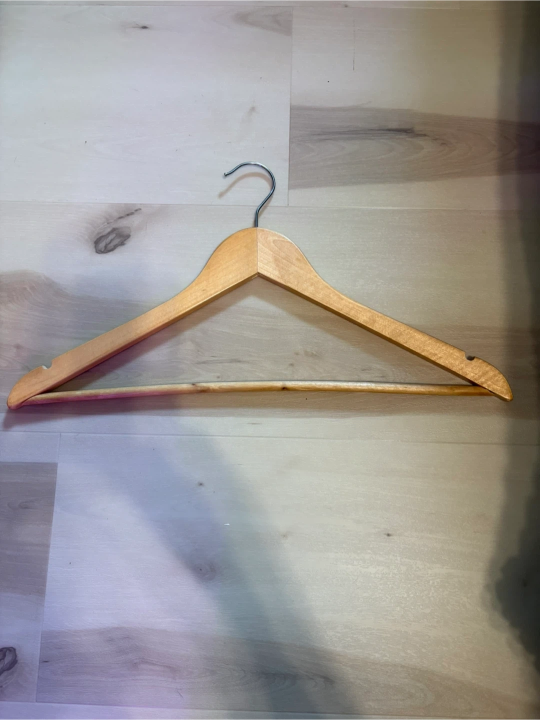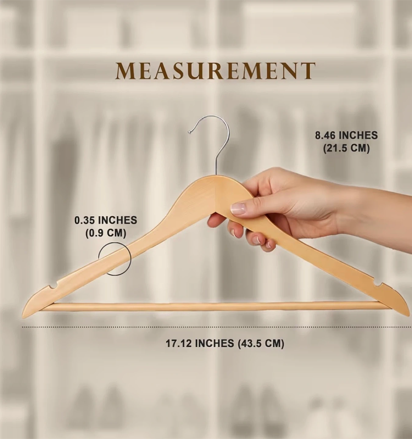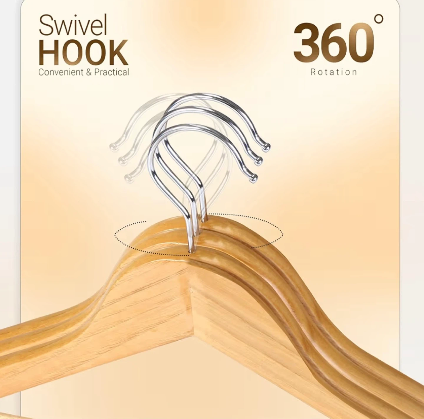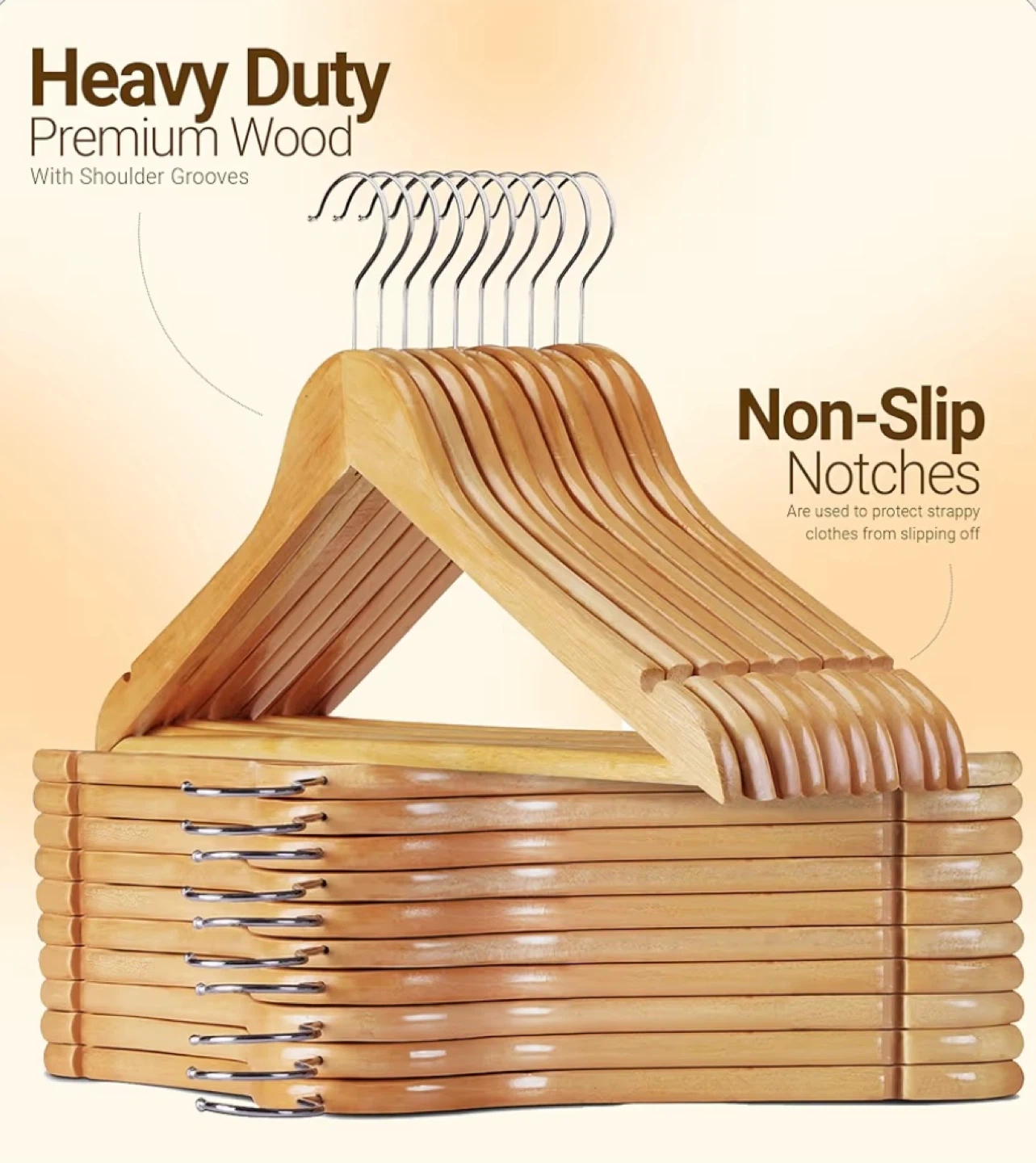 These heavy-duty premium wood hangers feature non-slip notches for strappy clothes and 360-degree swivel hooks. They're made of durable wood with shoulder grooves for added convenience. Useful for keeping closets tidy and clothes organized!