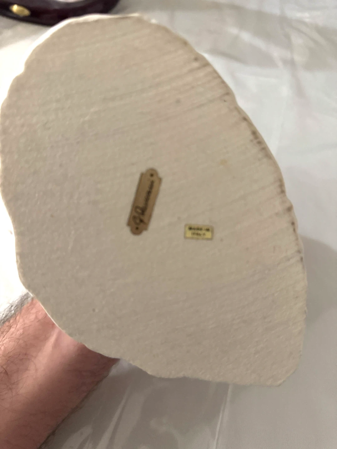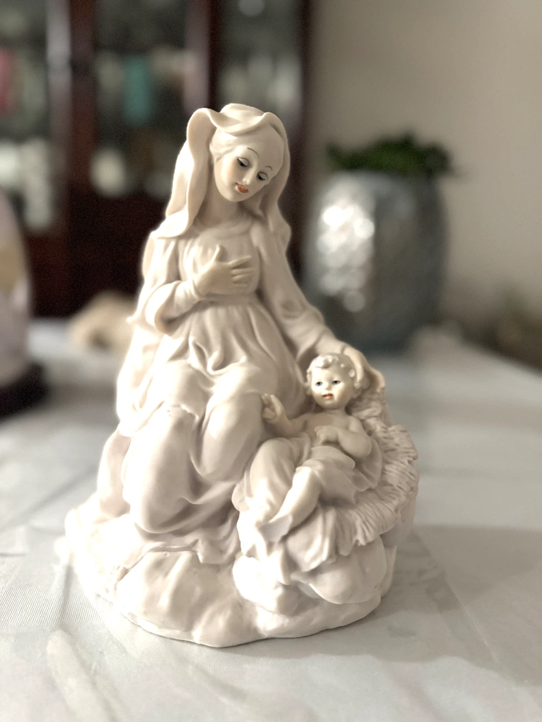 A beautiful Fattorini figurine depicting the Madonna and child. This piece is crafted from ceramic and made in Italy. It's a lovely addition for any mantle or shelf.