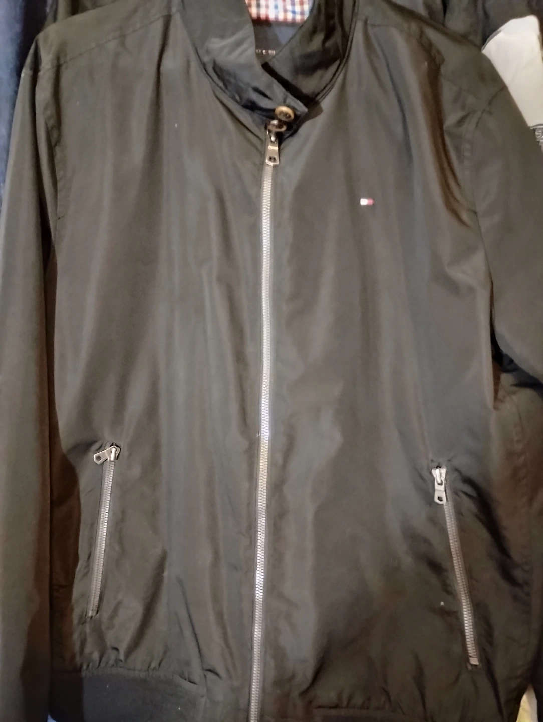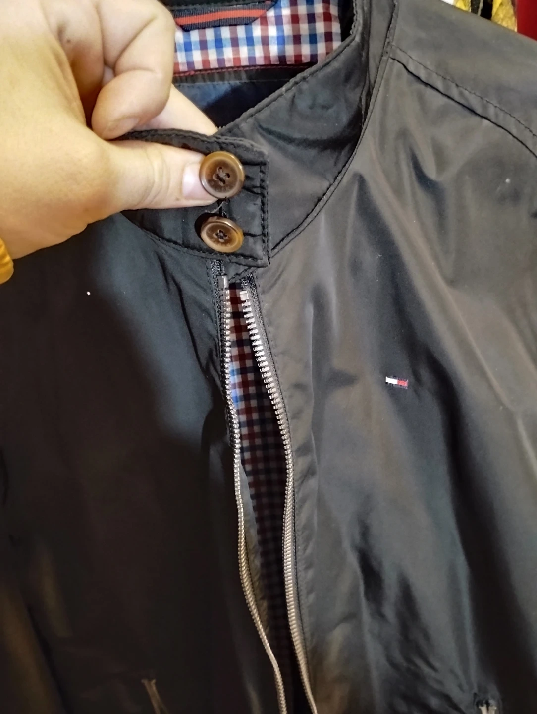This Tommy Hilfiger jacket is black with a checkered lining.